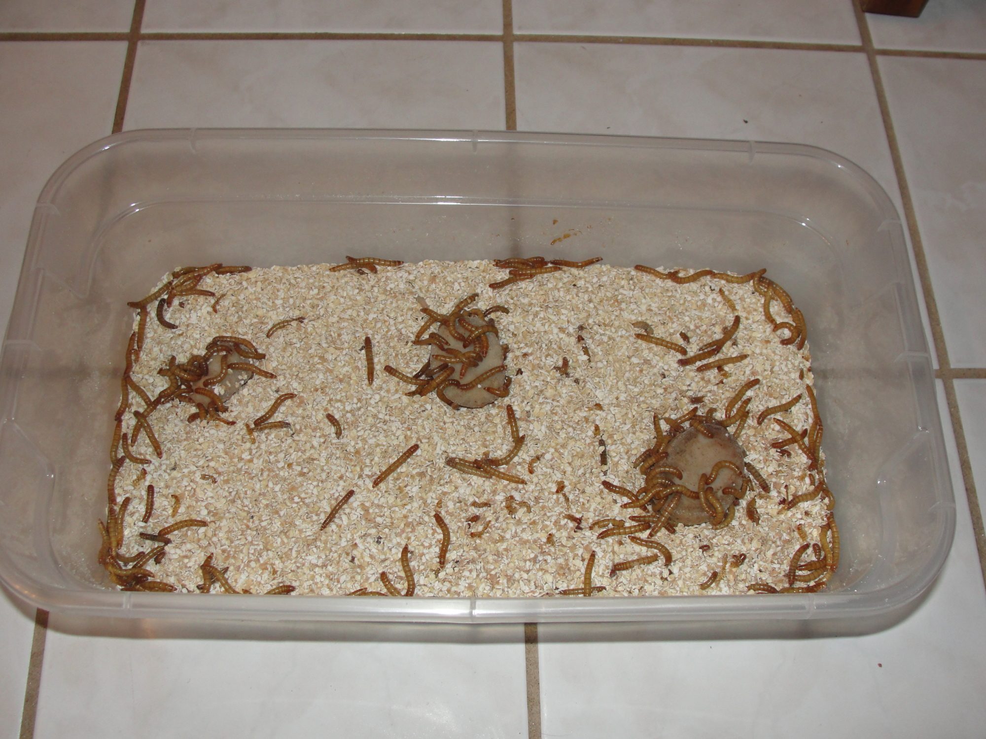 You were right Kass! They started pupating a few days ago. The first came out real clear and clean white and I moved him to a bigger bin so the worms don't try to nibble on him. The second has been trying to throw off his outer shell for a few days, having trouble. The third came out last night! They're all in the big bin now. I'm sure they'll be new one's every couple days now.