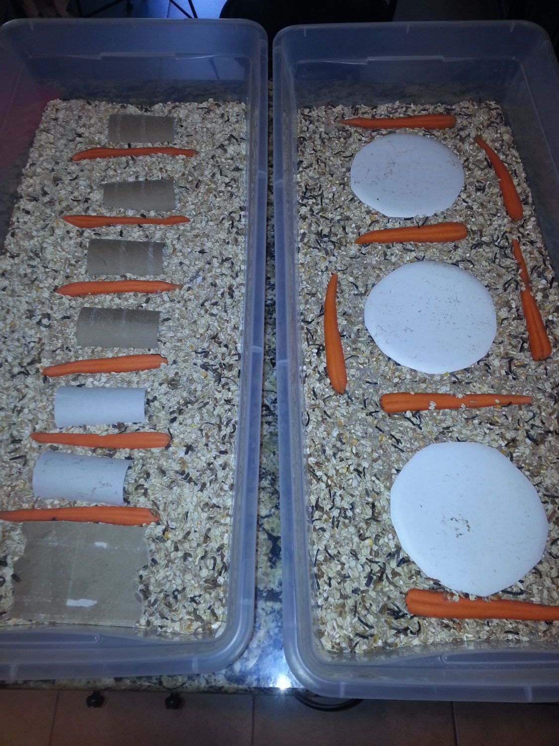 i set the DVD on one plate to help show the dimension of the bins. i pulled all the old vegetable matter and replaced the carrots. the 5000 worms have all changed to pupea and beetles i have not seen any baby worms yet but will look in a few days.