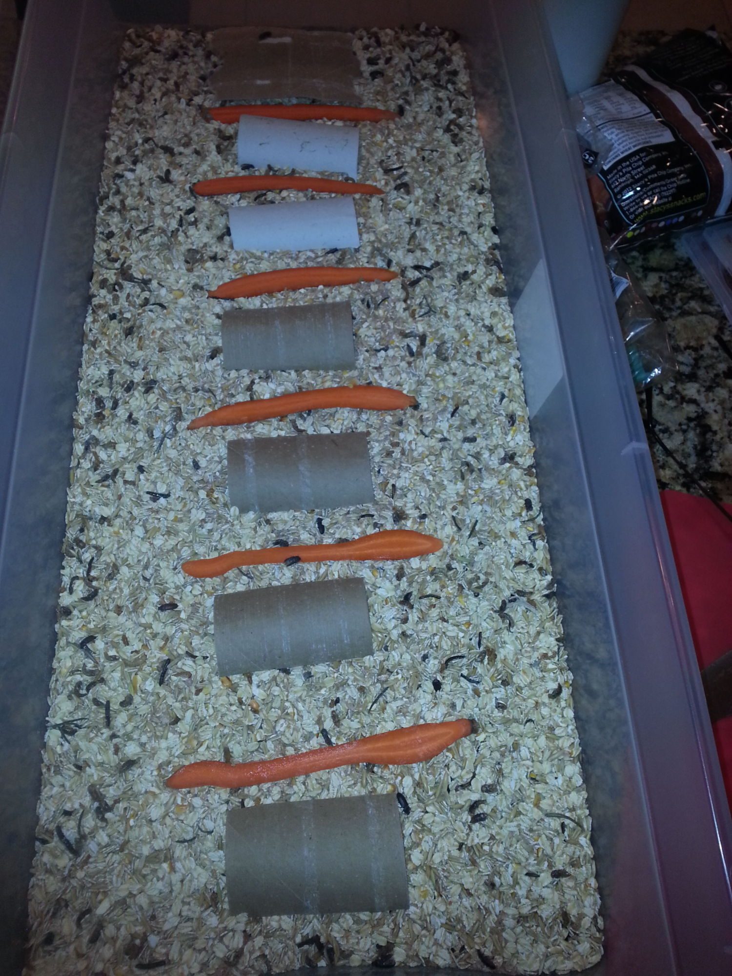 Quote: I don't know any better, but this looks to me like too many mealworms and too little bran. What should the ratio be? I imagined I would have to run my fingers through the bran (or oats or whatever one is using) to come up with a handful of worms. Really, shouldn't there be a lot more bedding-feed??