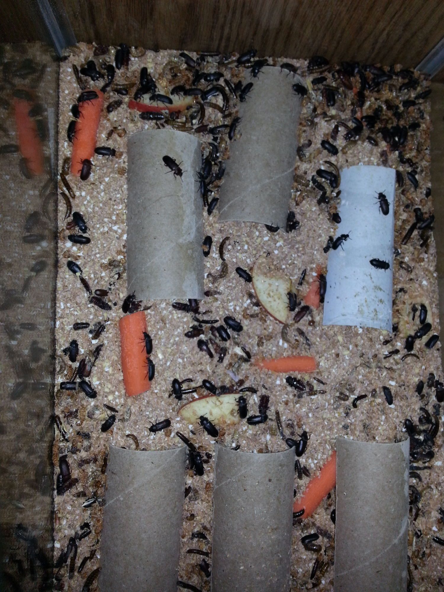 So I started my farm in October/November with 500 worms, then added 500 in December (they seemed to have alot of die off, they were from pet smart), then 1000 in February from amazon. I've seen beatles for months, and months, and months. I do not see larvae any more, or even pupa. They seem to do great making it to beetle stage then??? I've been doing them all in one container, should I do the split container Idea? I want this to be as low maintenance as possible. I will say that our home is fairly cool through the winter and the rest of the year, probably averages between 65-70, can the larvae live in this temp? Any ideas would be appreciated. I give them slices of apple and carrot every 2-3 days. here is a photo, there are alot of beetles under the half toilet paper rolls as well, the larvae I do see appear to be black and dead probably from that pet smart 500: