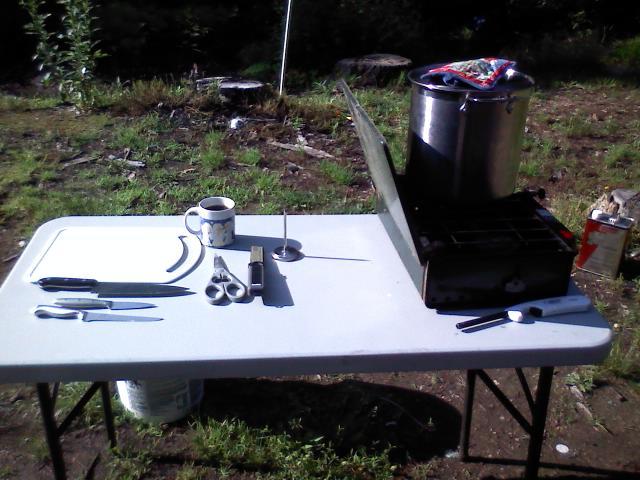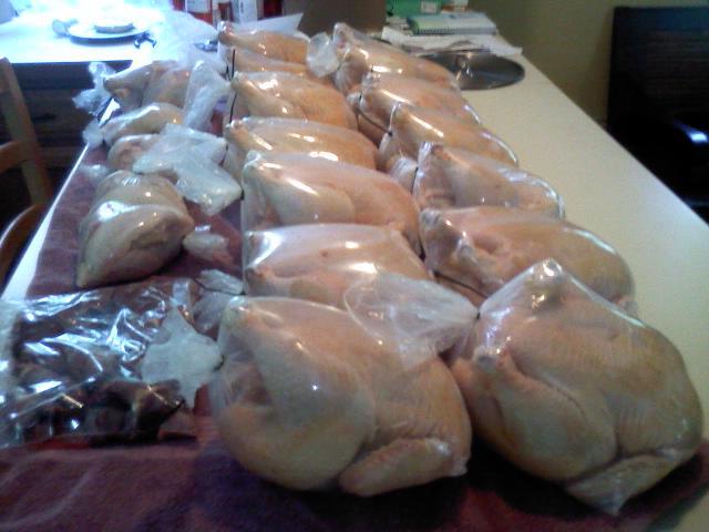 Well, it took me 6 hours from start to finish but I completed my first batch of meaties today. Working alone is great but it does take a long time. The process went as hoped and I have 76 lbs. of home raised chicken for the freezer. It has been a very rewarding day. To boot, after I was completed with this task, I looked out the window and saw the gray fox that probably ate my 3 other meaties, so now he won't be bothering anyone elses chickens. That just made the day better. I have included some photos of today from set up to product.