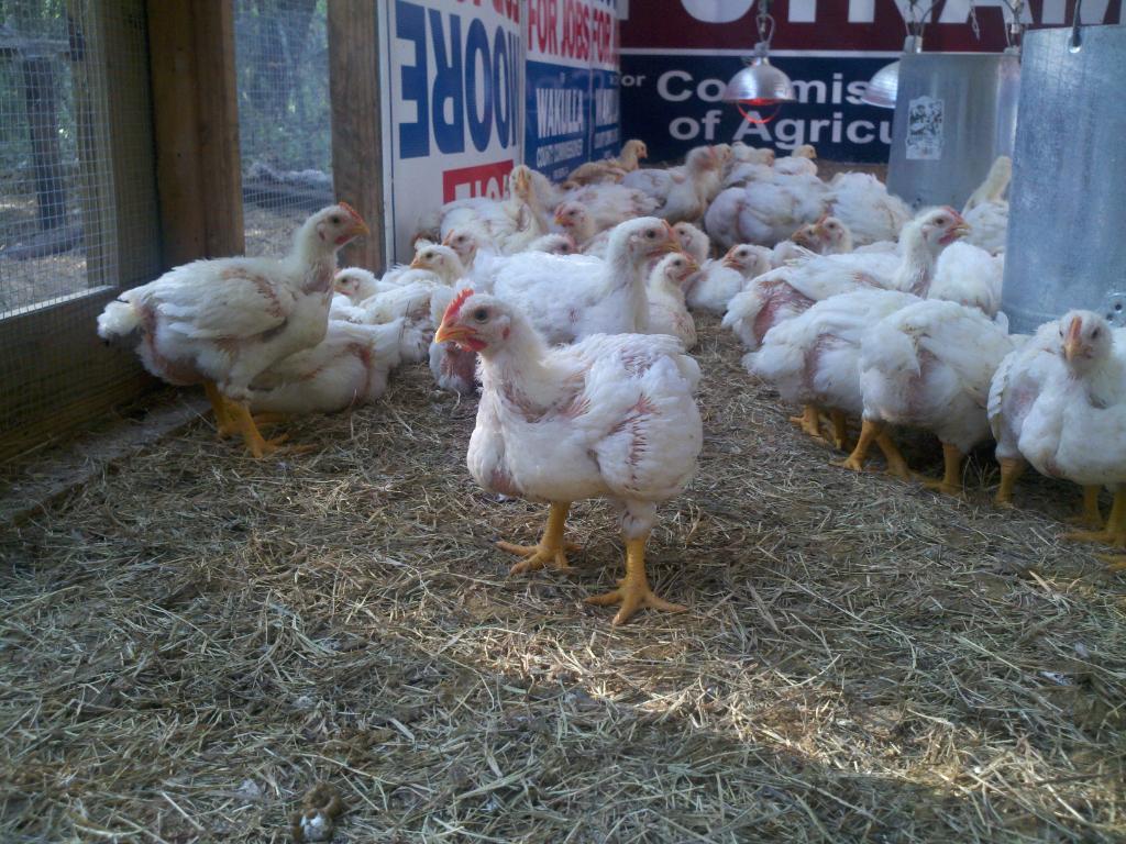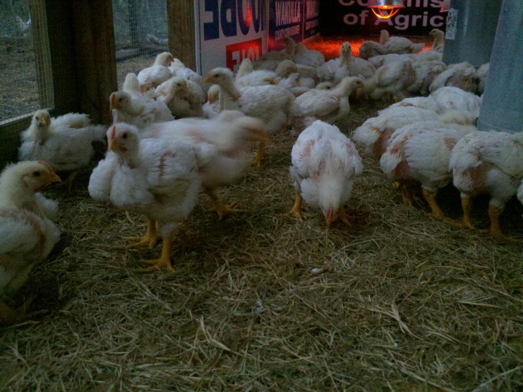 They are three weeks old now, but I haven't taken a picture this week. I'll get one tomorrow. They are much bigger, only a week later. 104 birds have eaten about 450 pounds of feed in three weeks. Only Cornish Cross can do that. At three weeks, the legs on these birds are almost as big as my 5 month old Leghorns. They are now moving with the Cornish waddle.