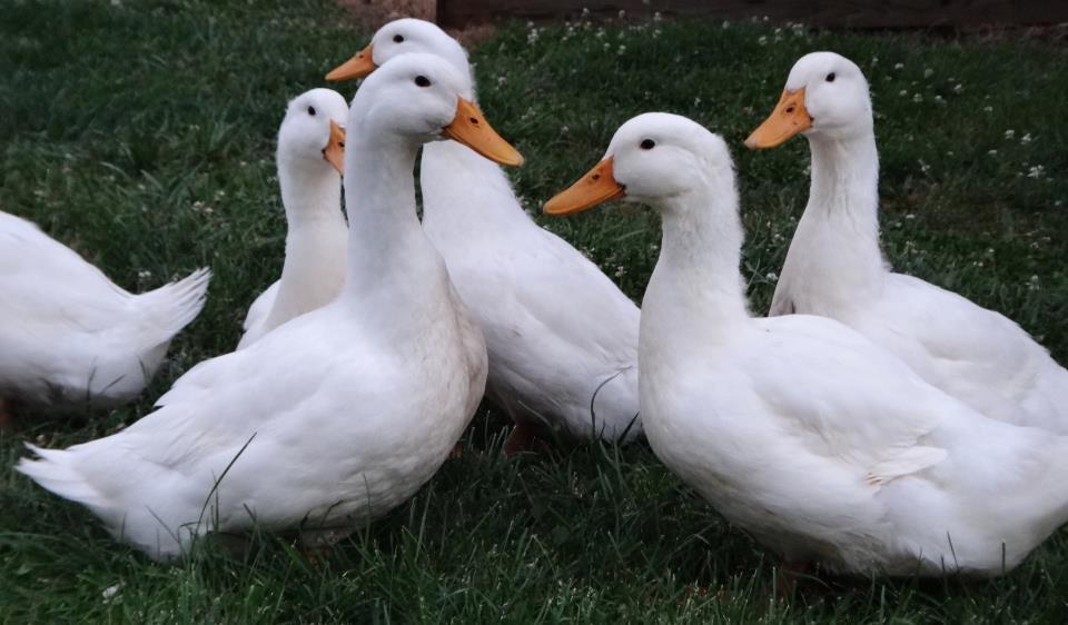 bahahaha! That's funny! Our 'call' is "hi babiessssss!" and then you here 11 females maaaap map map map all at once in response. And the 2 Pekins girls are THE loudest save for our 'sentinel' black runner who is very very loud and is the alarm of the group. But the girl Pekins - haha they are funny. The male Pekin Pip tries to shove his head at me sometimes (I assume push me around), it makes me giggle and he stares at me like...shoot that didn't work? :P