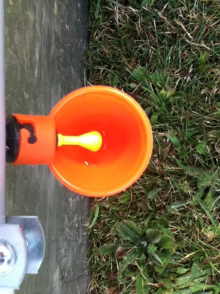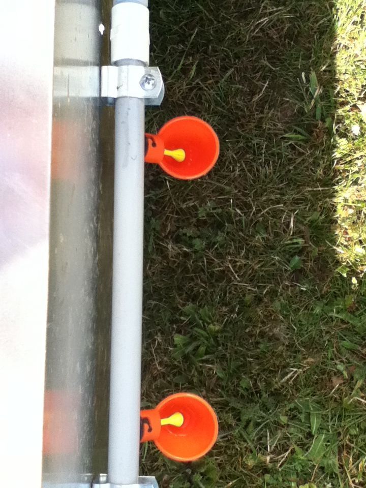 The drinking cups work very simply. When the a chicken puts it's head into the cup to get some water at the bottom, it accidentally pushes down that little yellow lever, turning on a flow of water as the bird drinks.Thanks for sharing thisI have thought about putting something on top of our tractors to hold the water. For now we are using hanging 2-liter bottles with the chicken nipple drinkers on them, but they are too low. I think since we are building several more we will simply make them taller so the water hangs at the right height.