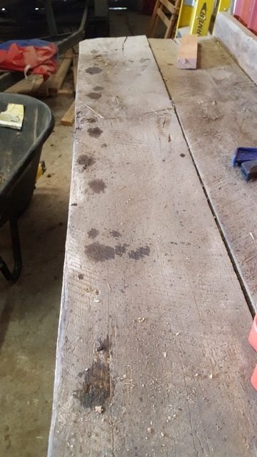 That was several lines of water that had dripped off the uninsulated metal roof. Found these water drops on an old wooden bench. That could just as well have been one of the birds if they were roosting under the drip line. BTW, there was nothing in the shed. With livestock in there, those drips turn to rain. Not good when things you have stored in there....things you want to keep dry......like hay, feed, etc. are getting wet INSIDE your building.
