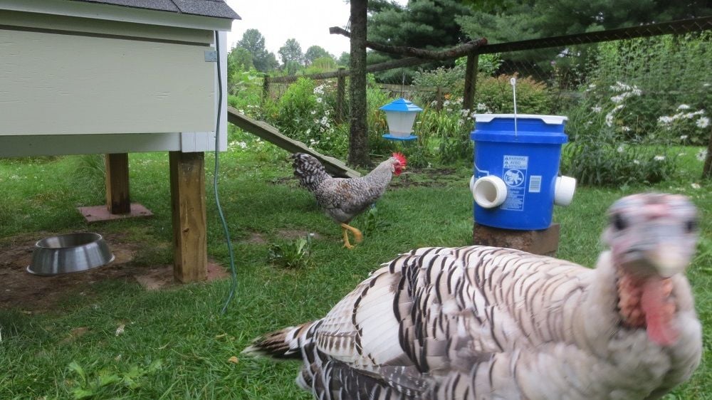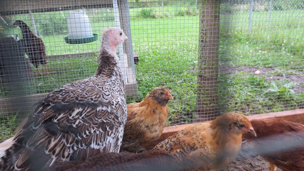 Here is Muffin, the Narragansett turkey in front of Westley, the Cream Legbar rooster.