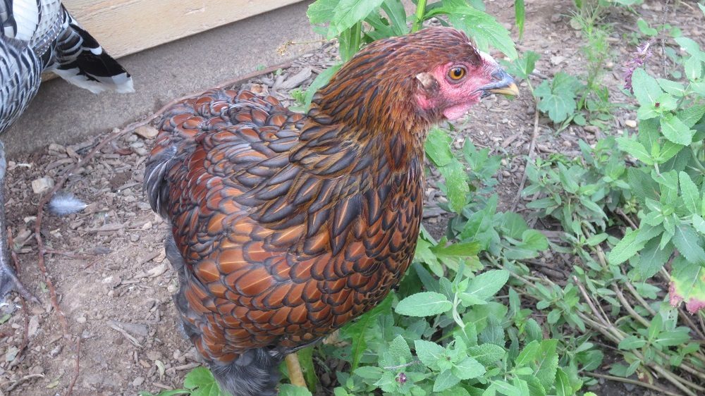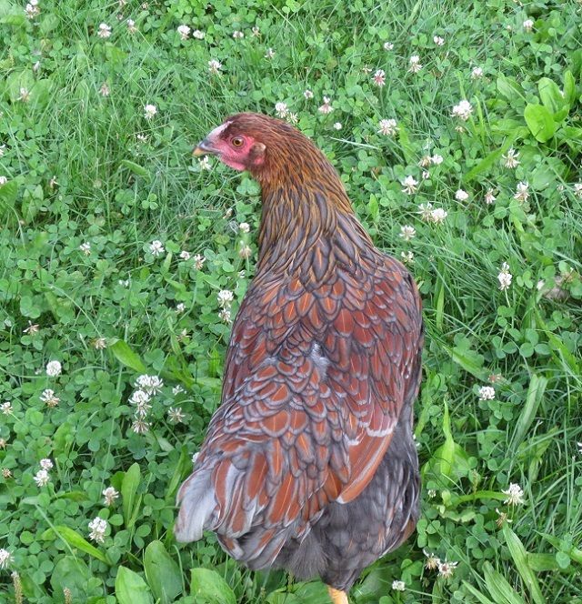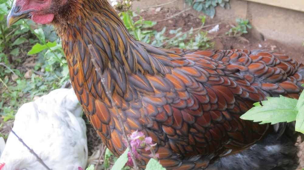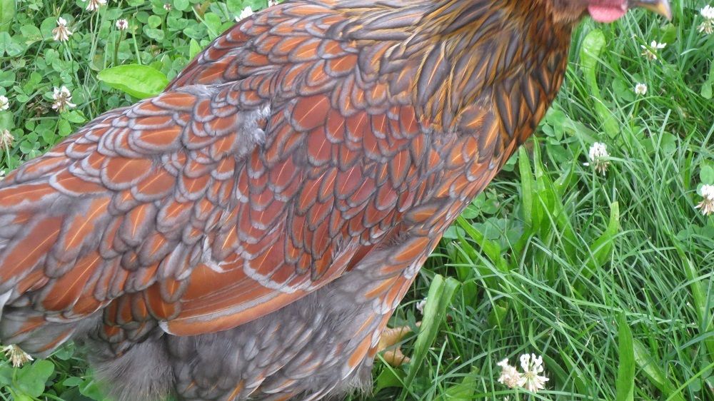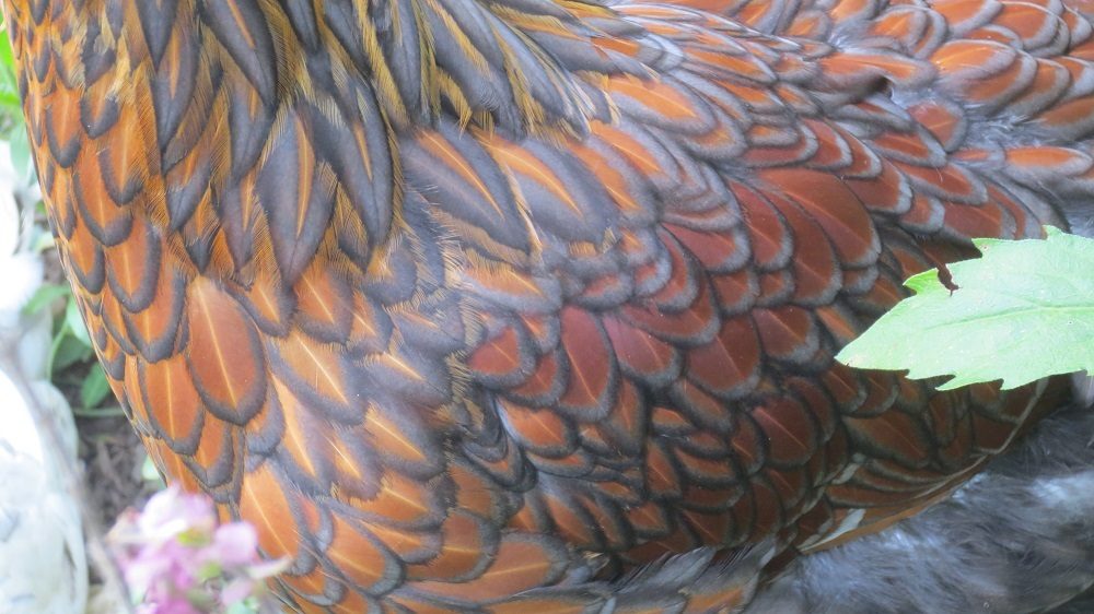 I've noticed that she has yellow on her hackles, orange on her shoulders, two shades of red on her breast and saddle, and then a real deep mahogany on her wings. And then the lacing is blacker towards her front, and lighter grey towards the back.