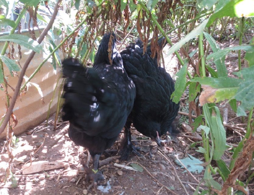 Maleficent has the yellow leg band, and Maid Marian has no band. They were 15 weeks old as of Monday. They wouldn't come out of the shady weed patch, so another lousy photo.