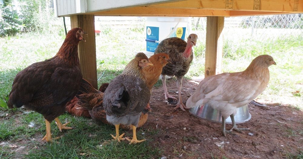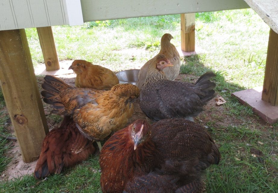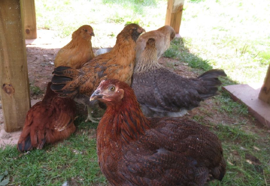 The Partridge Rock (Ella) is the larger one, and she is 11 weeks old. The rest are 9 weeks. (Easter Eggers, Buckeye and Cream Legbar.)