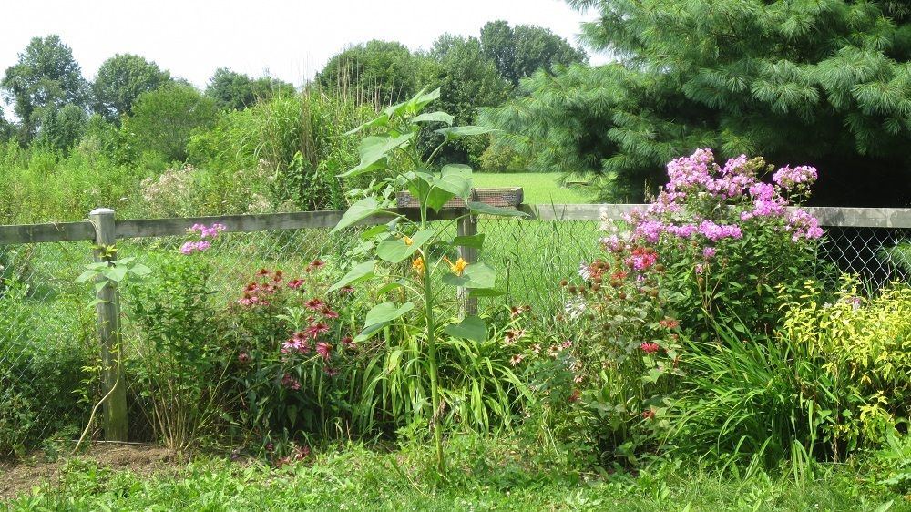 My weeds have been really out of control this year, but I hacked away at this corner the other day and it is doing better. I really love how the volunteer sunflower placed itself right in front of the corner.