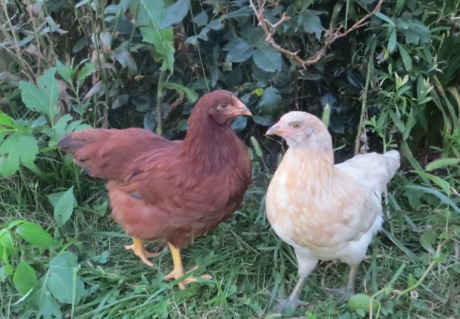 Cornelia has had her ups and downs this past week, everytime I think she's fully better, she has a little episode of shaking her head, stretching her neck and opening her beak, or hunkering down and puffing her chest out like in the pick on the left. At first I thought there was something hard stuck in her throat but it's just how she is curving her spine. However this is now just once a day for a few minutes, usually after free ranging. The little girls have been attacking the hostas with much vigor, perhaps the thick fibrous leaves are just getting stuck in her throat. I've been just massaging her and squirting a bit of water into her beak to help things along. She has been eating and drinking well, crop is full at bedtime and empty in the morning so not too worried.