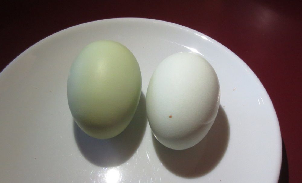 Next to a Lavender Ameraucana egg, which is a pale greenish color.