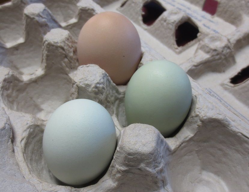 Same two eggs with a Barred Rock egg. These are the only three eggs I got today, because I think one of my Lav Ams is getting broody and not laying. Actually, if this is my Olive Egger egg, I sure hope she is going to get her pigment in order soon and make them darker. I had been thinking it would be dark, like a Marans egg, but with the blue underlayment.