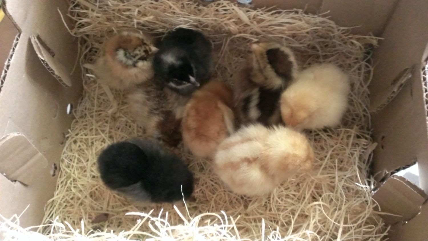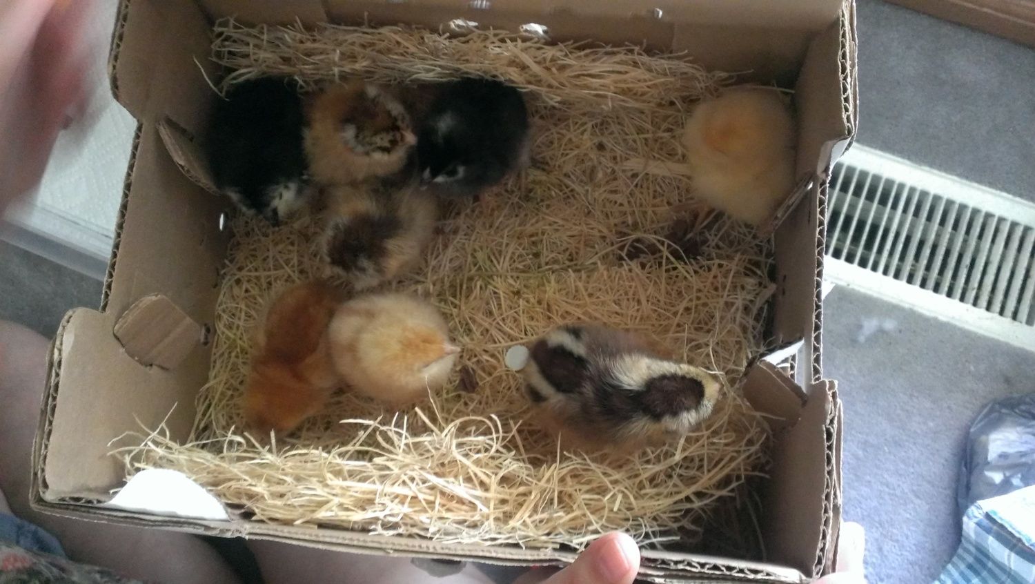 Adorable!! Love he little silver EE's!!!As promised, here are some pictures of my chicks that arrived this morning!Here they are when we got them home, ready to be unpacked from their Meyer's box.Finally in the brooder! After a quick beak dip in water and being shown where they can get warm by the Brinsea, they start to drink and eat.Yeah, I had to put something under their water to raise it up so they wouldn't stand in it. LOLAnd here we have the Black Australorp and the little Barred Rock in front. The Barred Rock is doing much better now, thank you!Here we have two of the spunkier members of the chick posse. A Rhode Island Red and a Brown Leghorn. So far, I can see the Brown Leghorn running the roost one day. Very feisty!The one in the back is the Buff Orpington and in the front is the Golden Buff. Both are very sweet chicks.As much as I tried, I just couldn't get a good picture of the two Easter eggers together! So, here they are separately...Easter Egger #1 is my most fluffy chick by far! Her cheeks are insanely poofy! Very sweet disposition, too.Easter Egger #2 have very distinct chipmunk markings on her back. Not quite as fluffy as the other one, but still impressive enough fluff!That's it for now!![]()