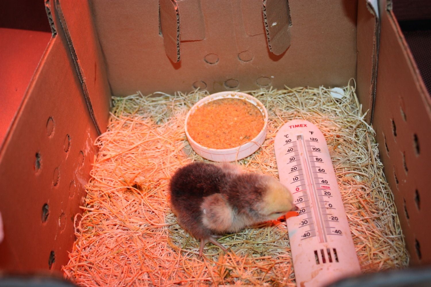 The electrolytes and vitamins seemed to have helped her a lot. Just in a few hours she is speeding around the box. She is still separate for now. She keeps falling into the wet food and water still.