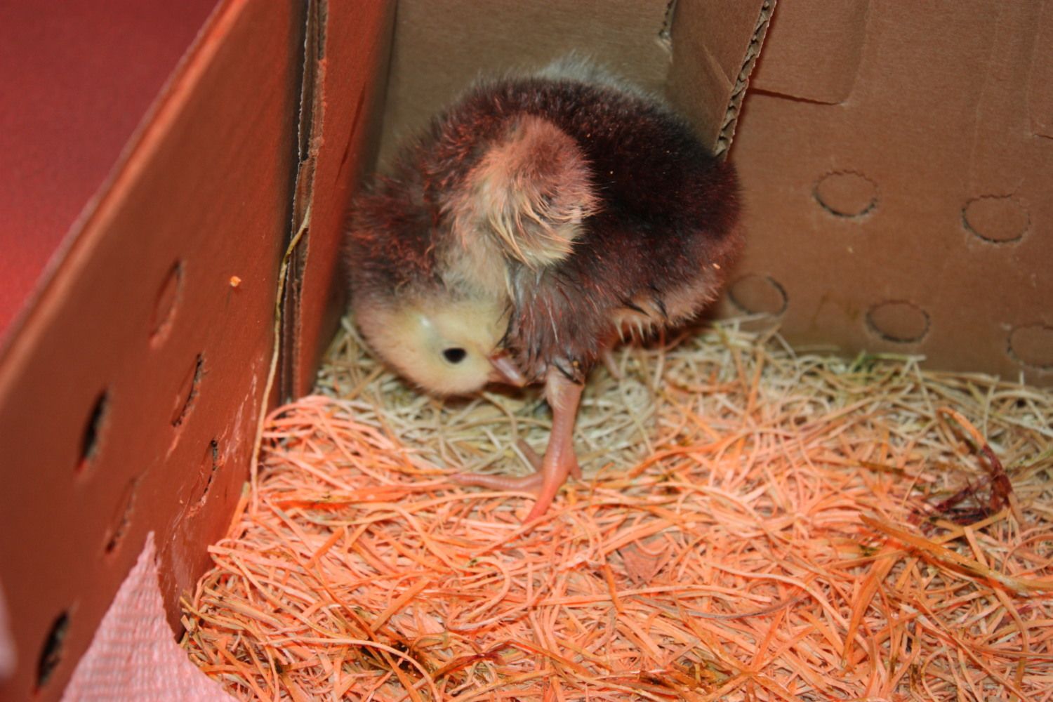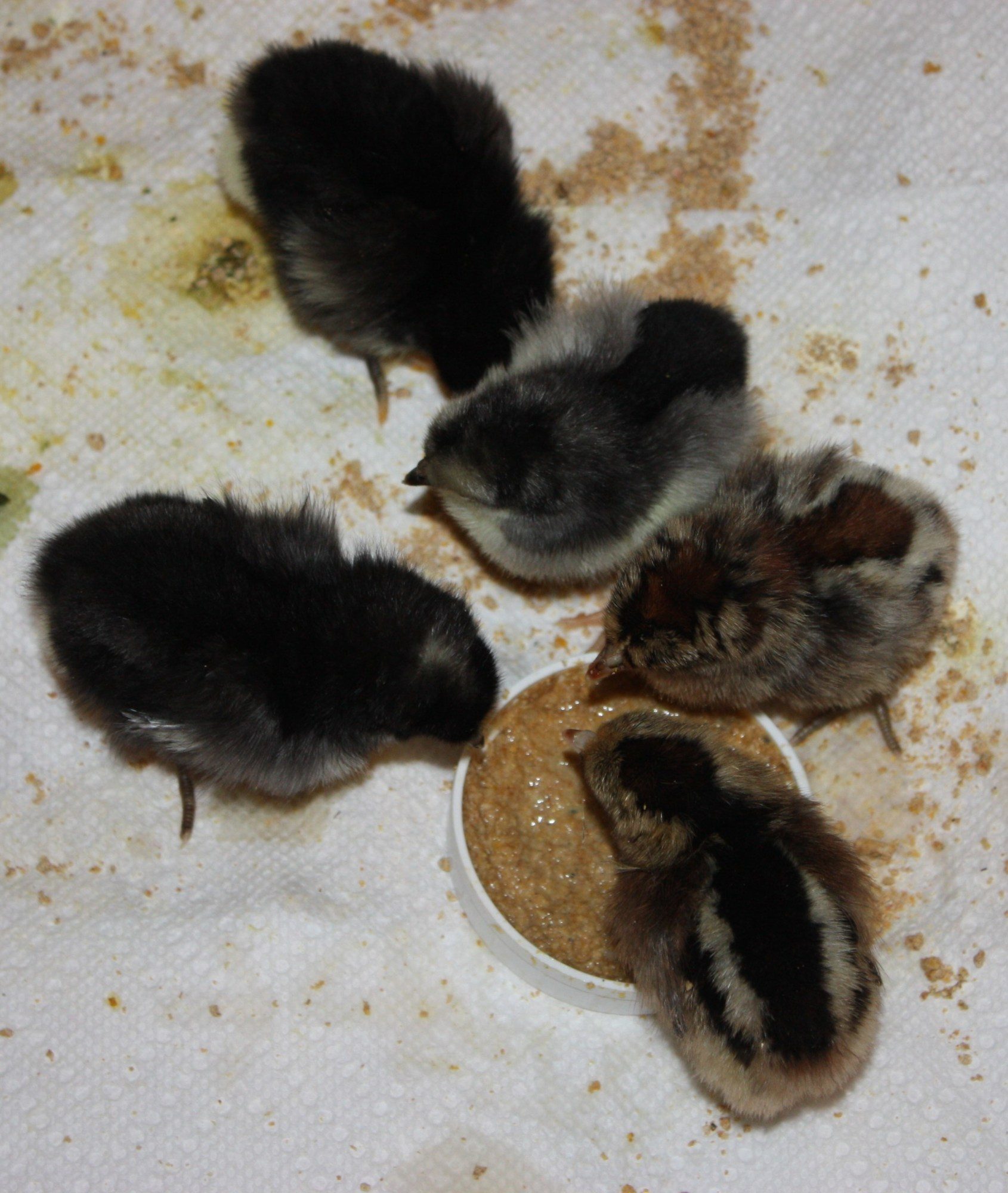 Here she is trying to clean herself up from falling in the food and water. She is eating tiny bits of dry food and is still running around, she still needs to get control of her muscles. She does drink on her own. I am hoping that the improvement continues and I can put her back with the others. They were trampling her before and pecking at her, so I'll try in a couple more hours if she keeps improving. She is a feisty one and a fighter.