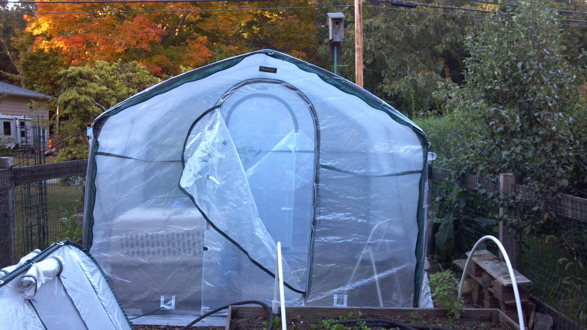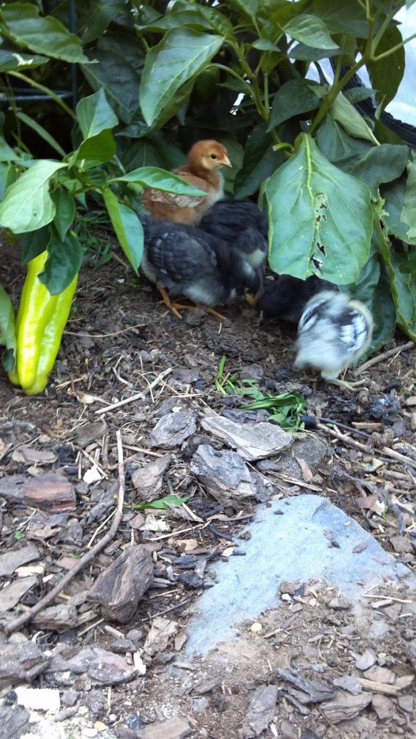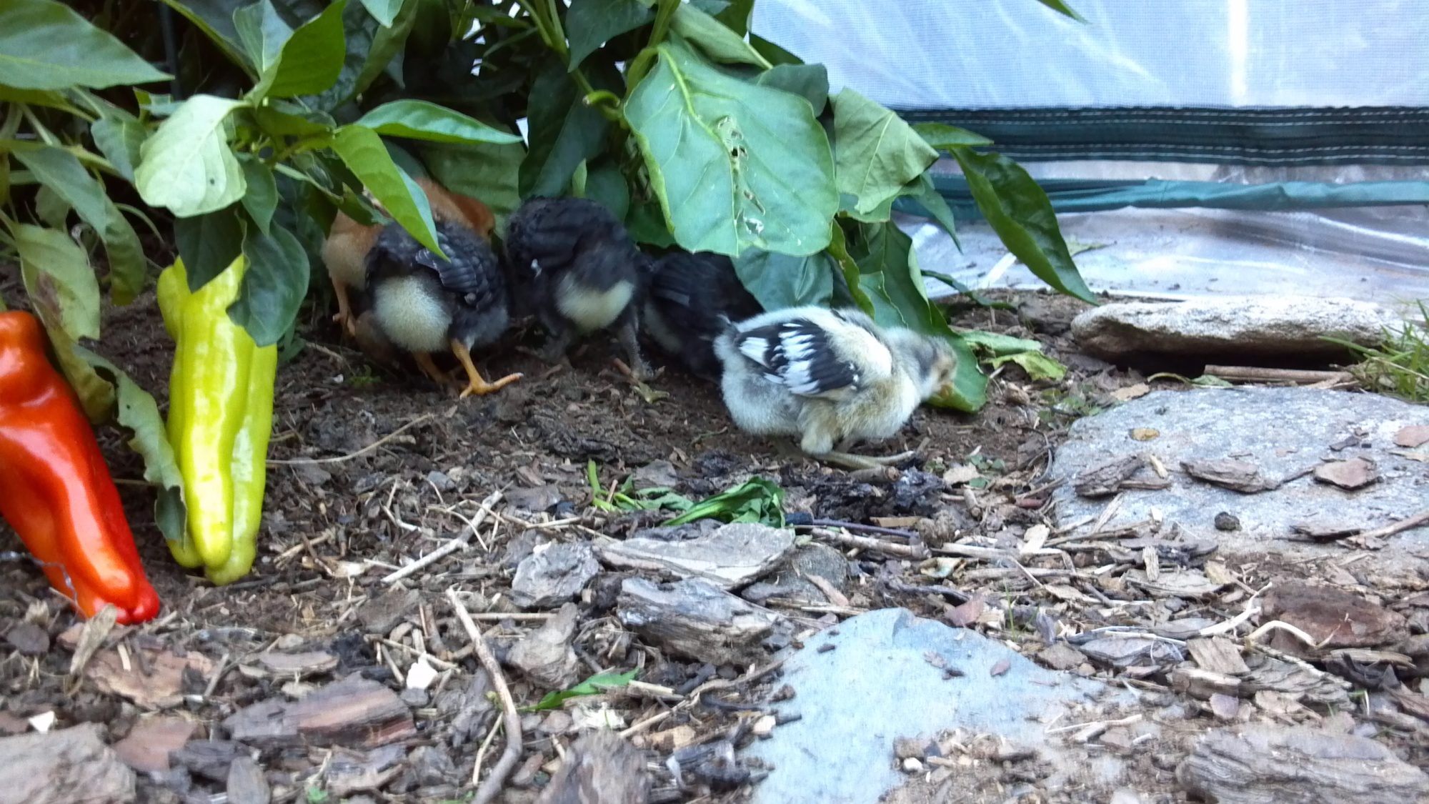 Moved my Meyer chicks (received Sep 17th) out to a pop up greenhouse. Covered a large pepper plant with it too so the chicks have a jungle to run around in. So far I can recommend this approach. They are locked into a large plastic dog kennel at night (with their ecoglow). So funny to see them zipping about, running and "jump flying." I heard some emergency peeping a couple of times over the weekend and went in to "save" someone who had gotten turned around behind the dog crate. Tough to get pictures of them, they move quickly.