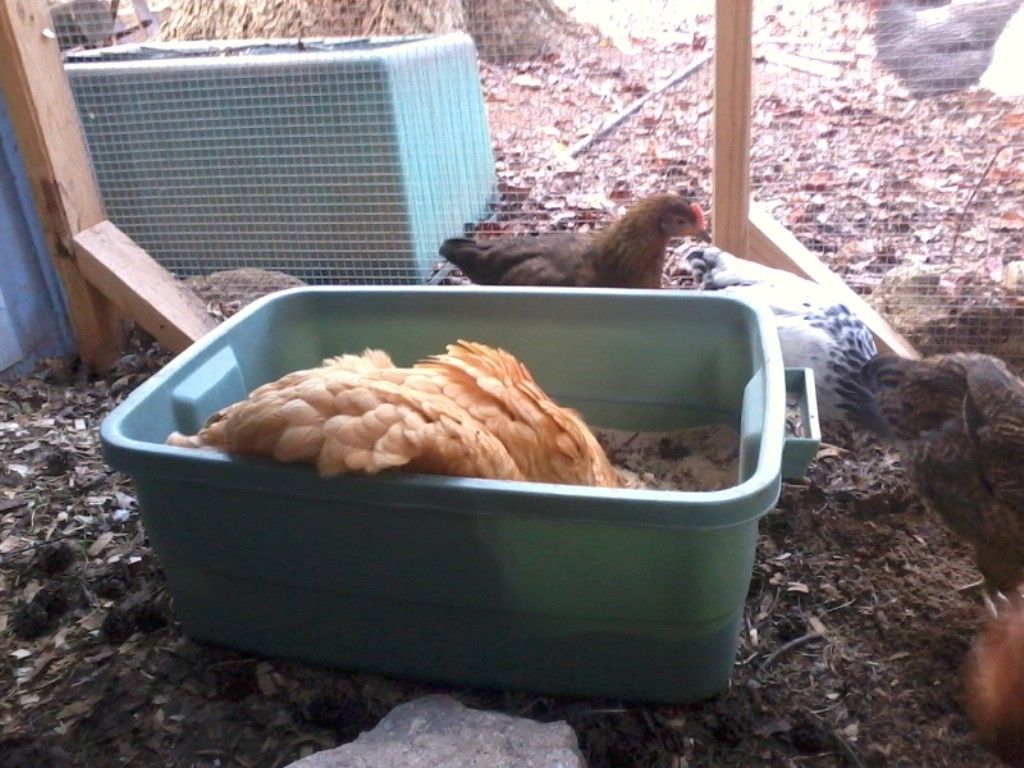 We used a turned over lid for a large trash can and that was not deep enough, so I just put a storage tub that was fairly deep in their run area, it is under the part of the run that is covered from rain. They love it and it is so deep they can't shake everything out of it. Here's our giant chicken, Big Mama (BO) using it.Geez! That's crazy. I'm always afraid of the girls finding stuff like that.