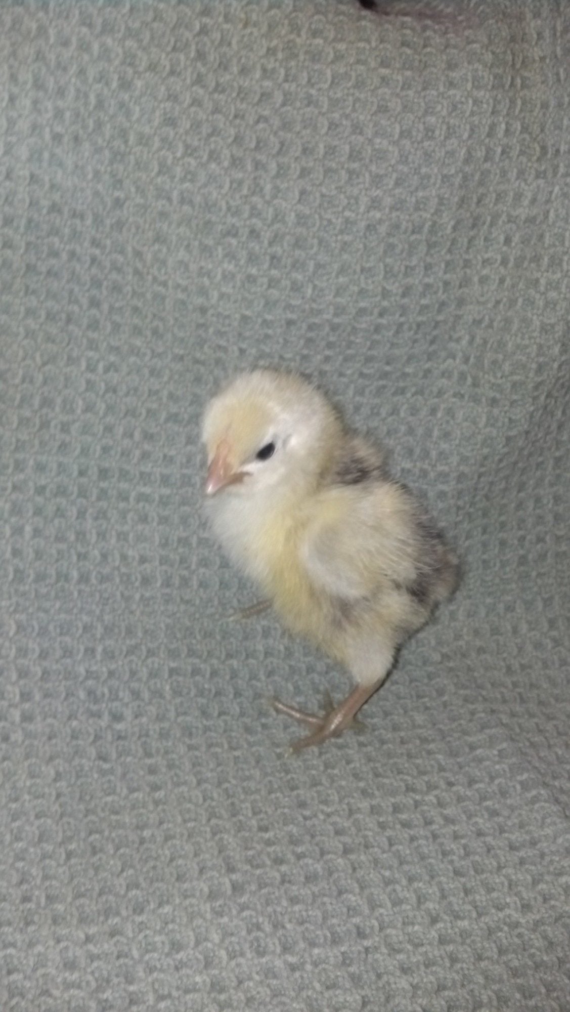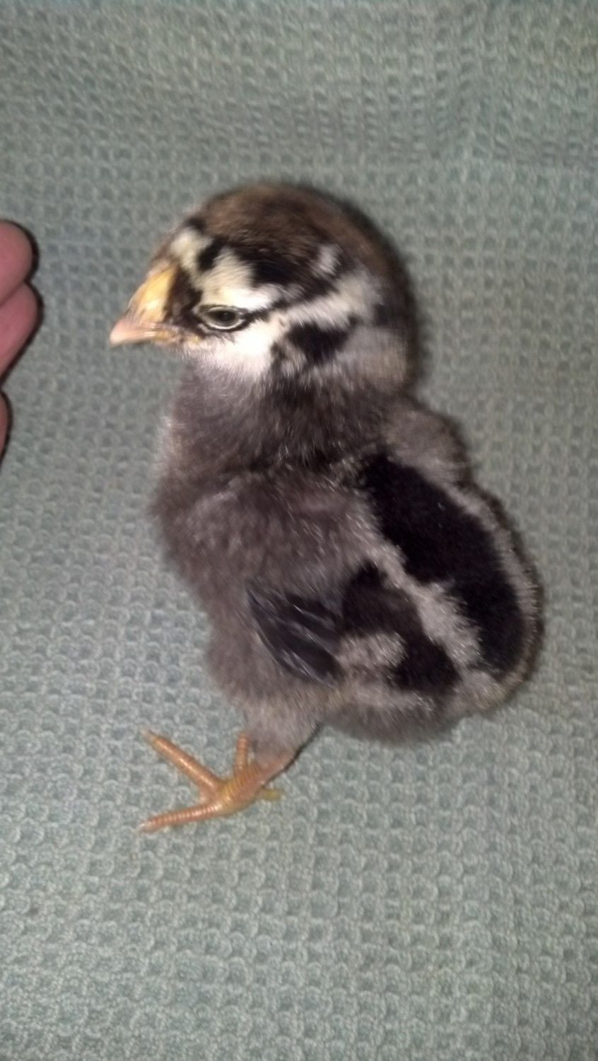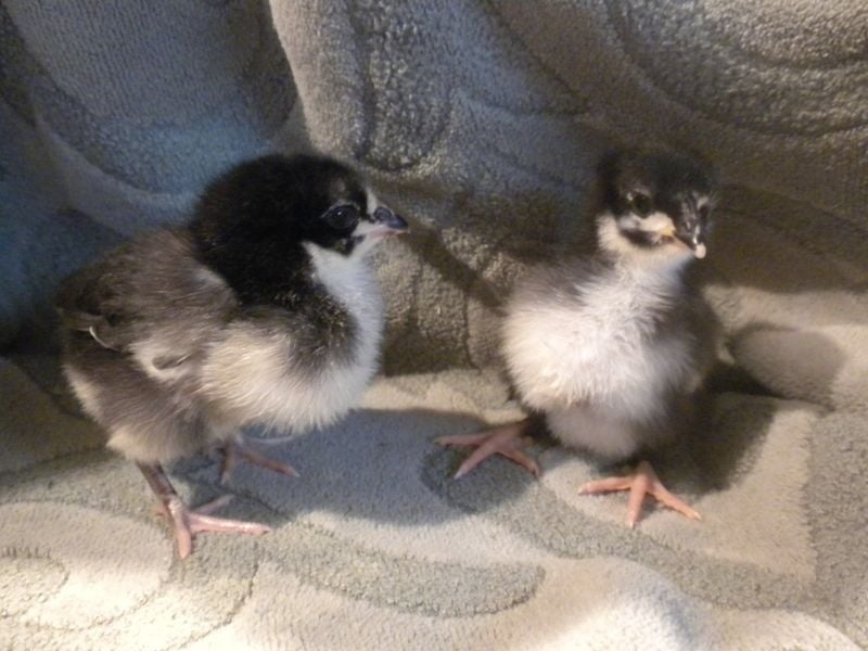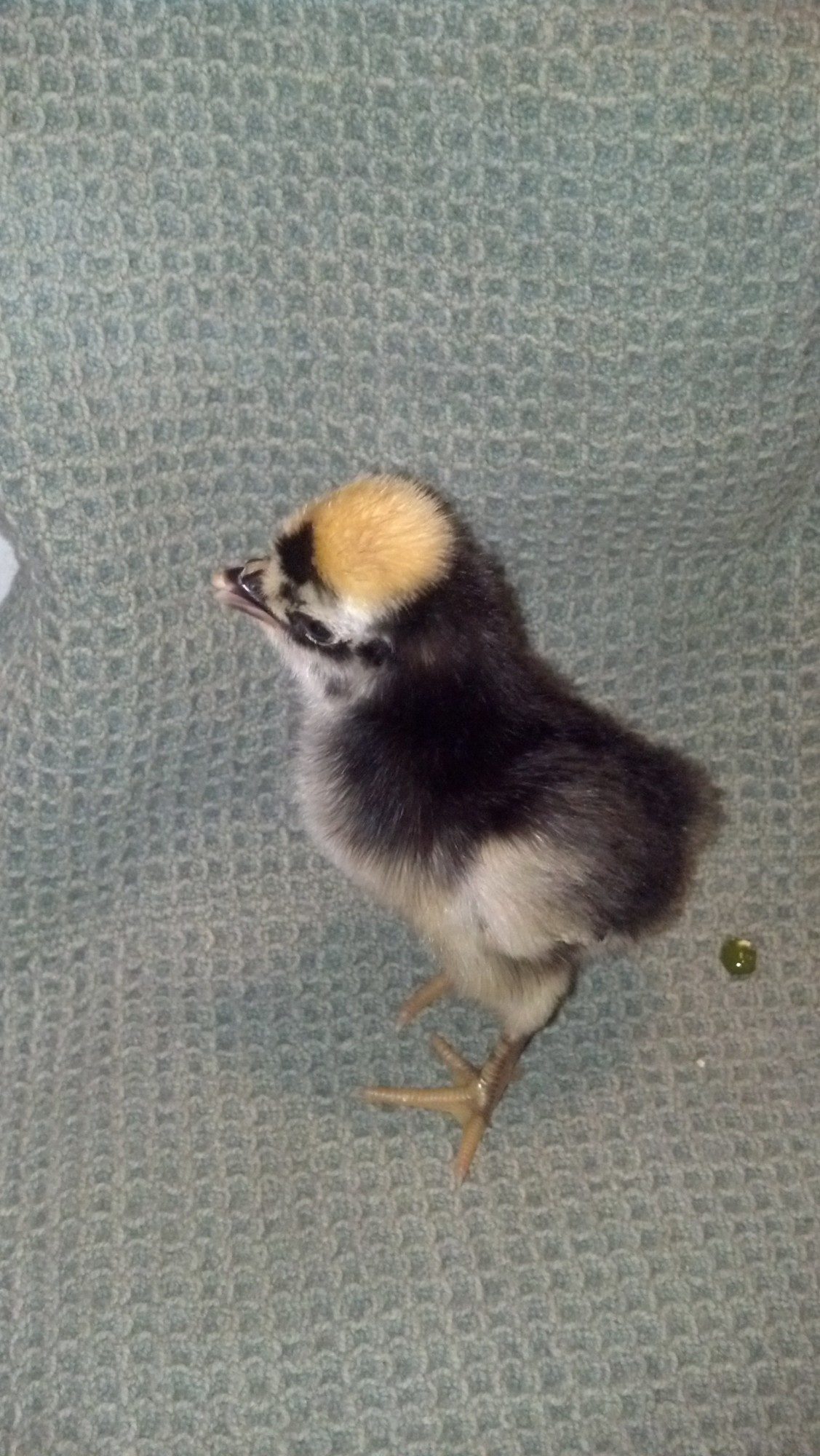 Hm, no beardy face... It almost has to be a different breed, not an Orpington. I can't imagine hidden genetics throwing that many feathers on the feet of a bird whose parents (we can assume) are clean-legged. Guess we'll have to wait and find out as it grows.