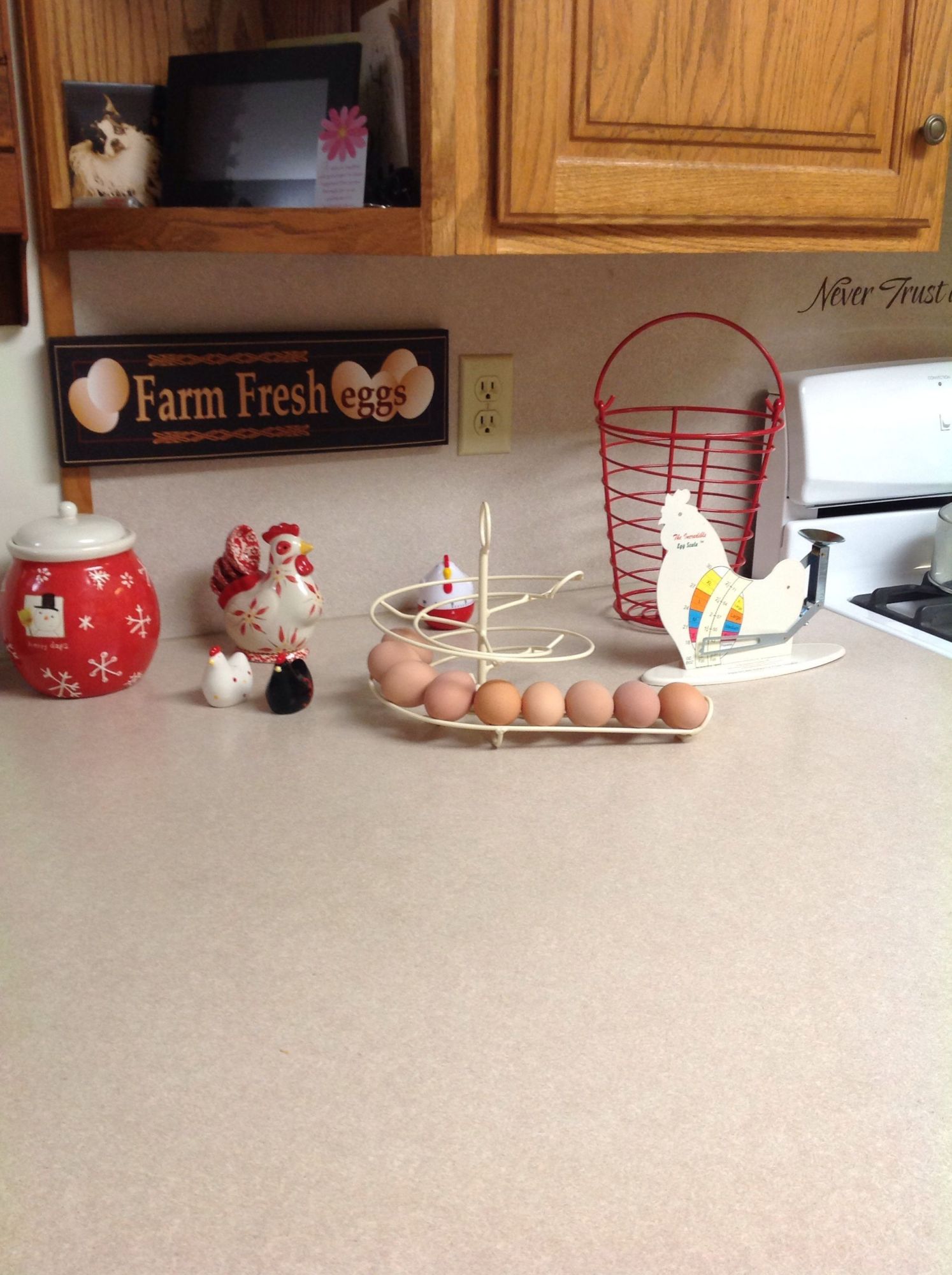 I am so envious of all those eggs on your skelter! I love your sign, scale and other chicken items! So cute. I really want a chicken salt and pepper shaker set too!