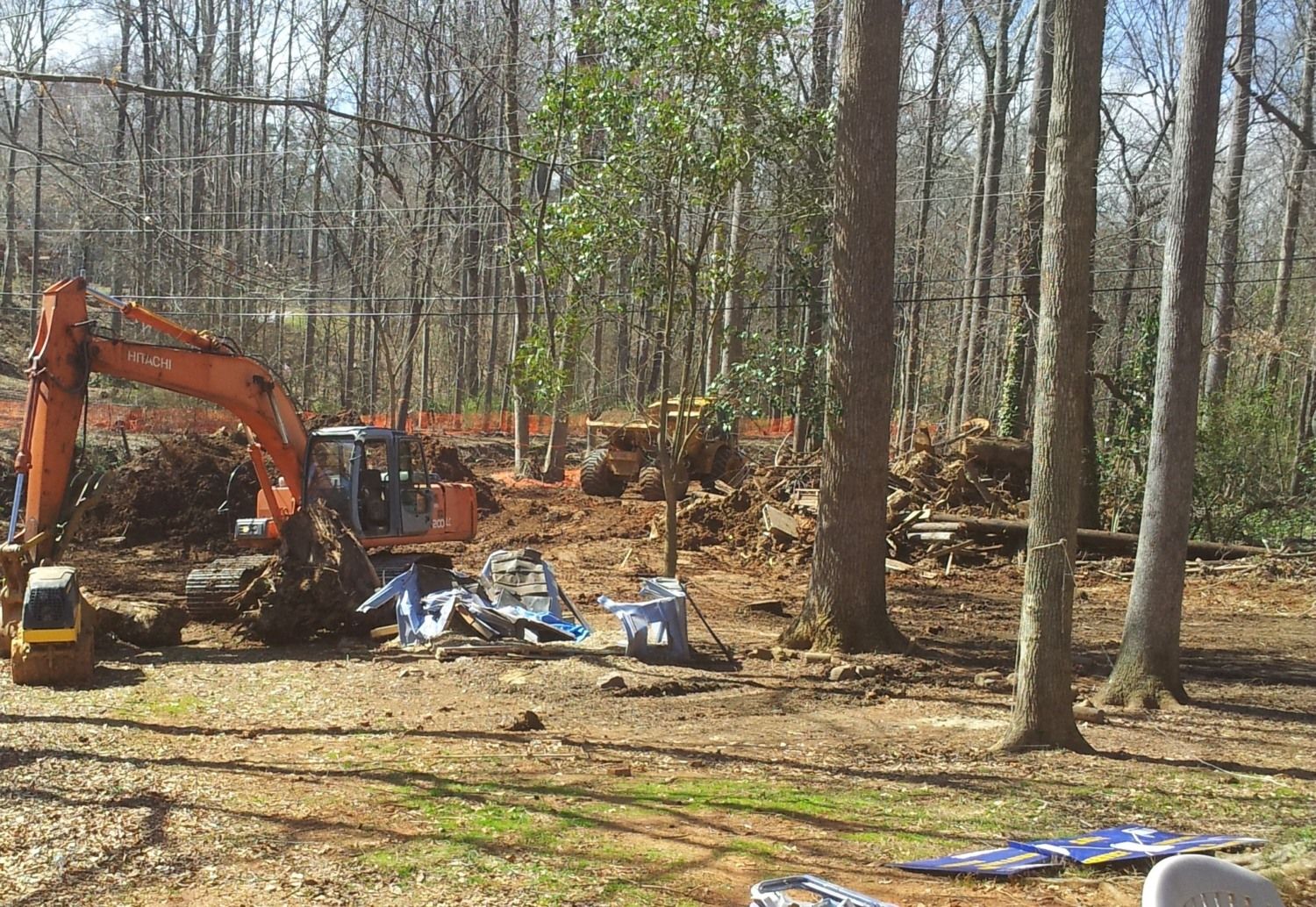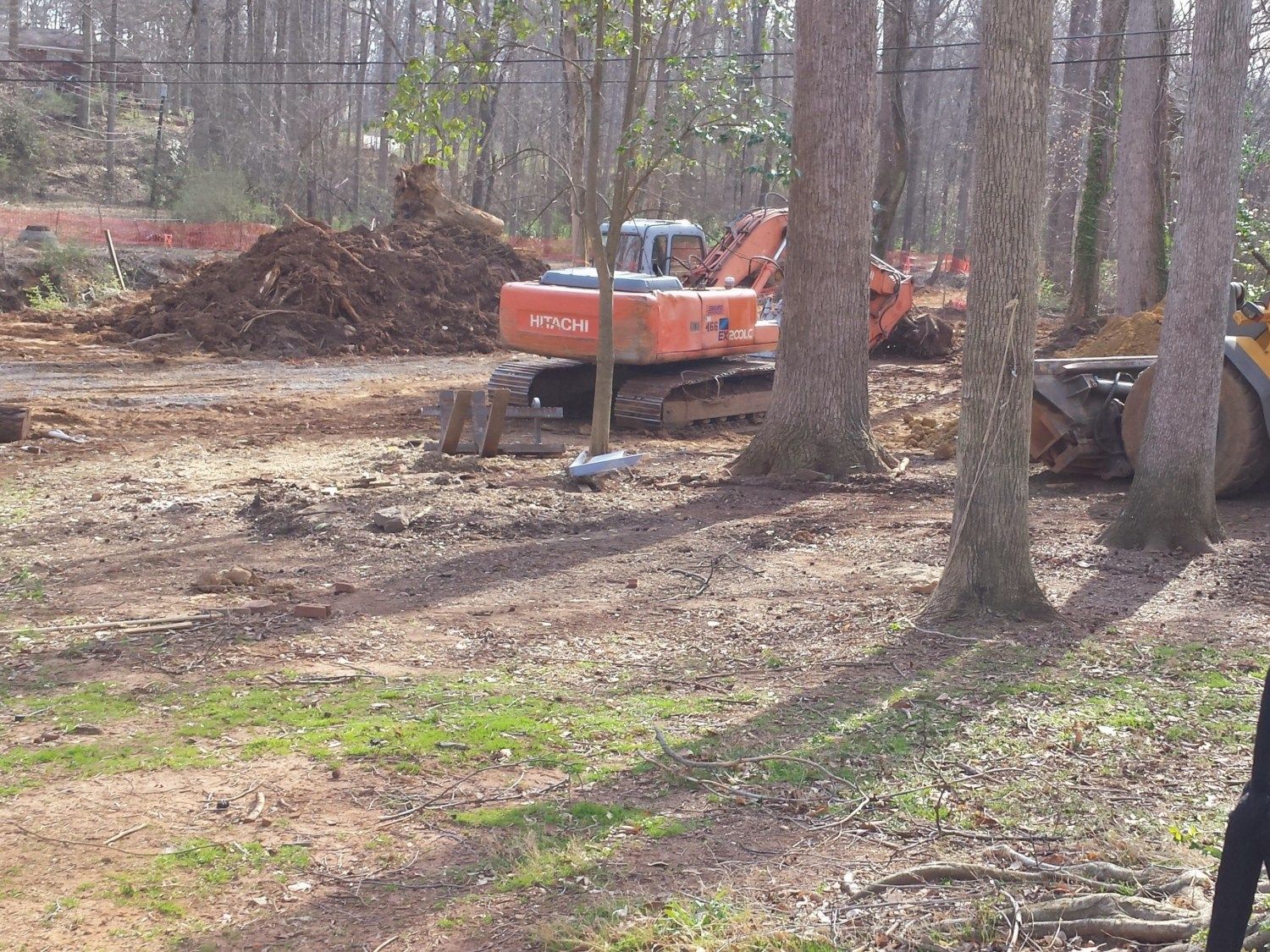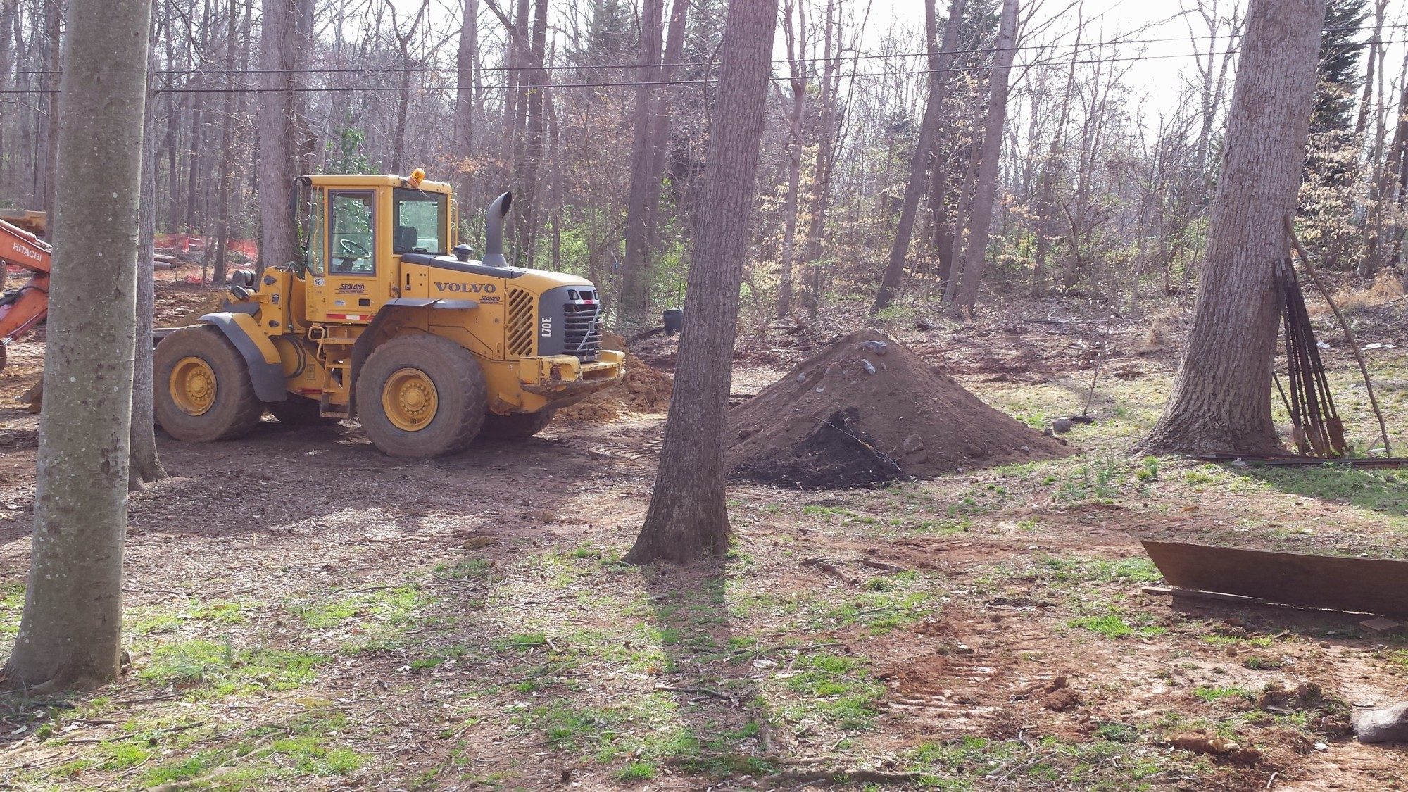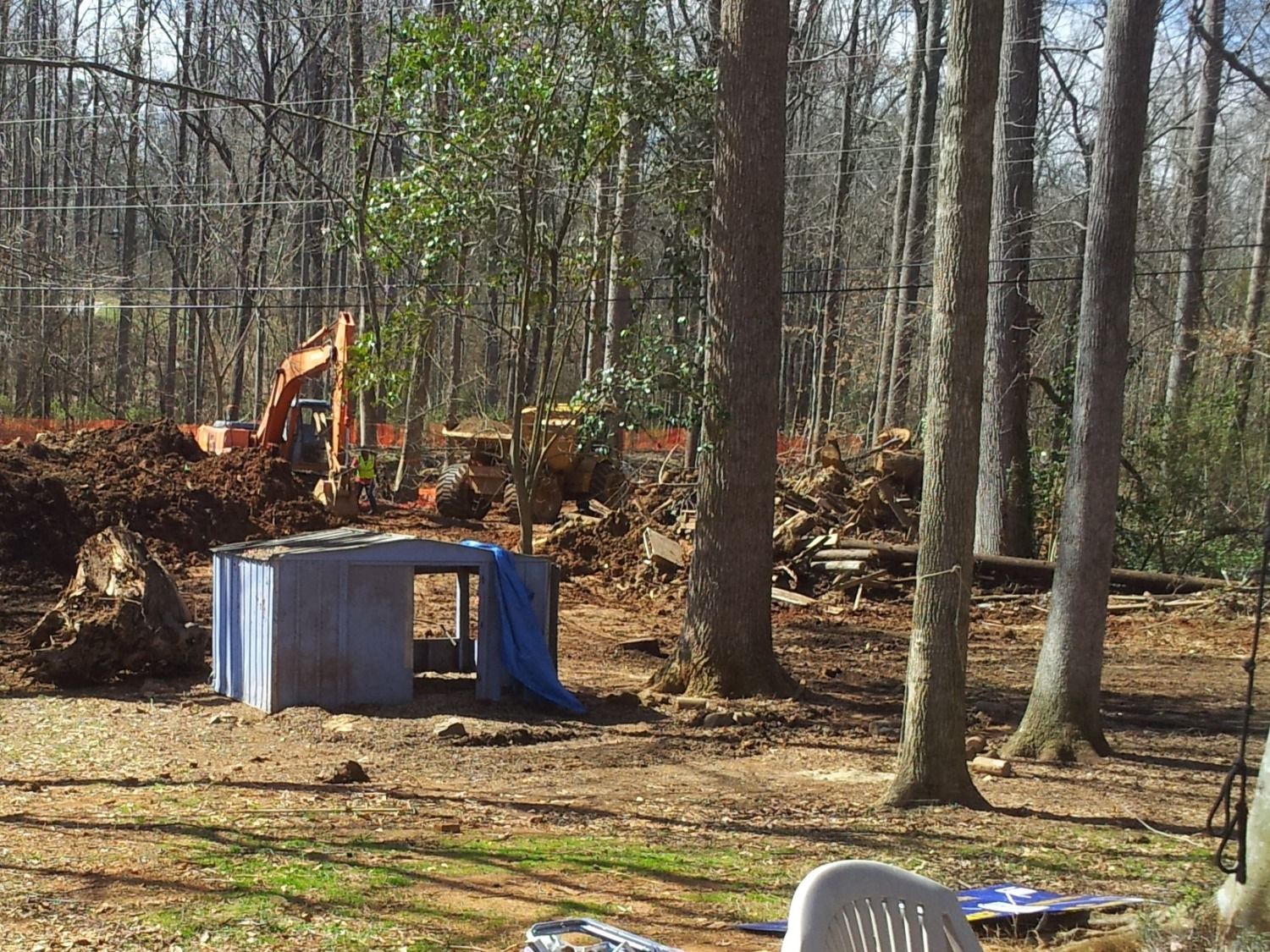 This is where the garden was, right where the yellow vehicle is. We removed all 13 of the 8 x 4 raised bed boxes and my 3 compost boxes and then they pushed the soil up for us in that big pile in the picture.