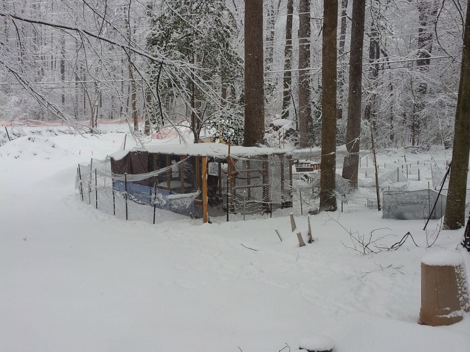 Here it is last month after the snowstorm. We gave them a outside area covered with bird netting on the left of the shed and they also could get into the garden on the right of the shed. If you notice the 3 trees in the pictures you can see the progression of what has been done this week.