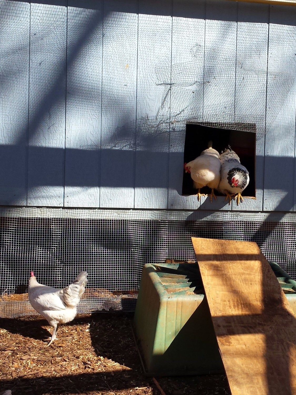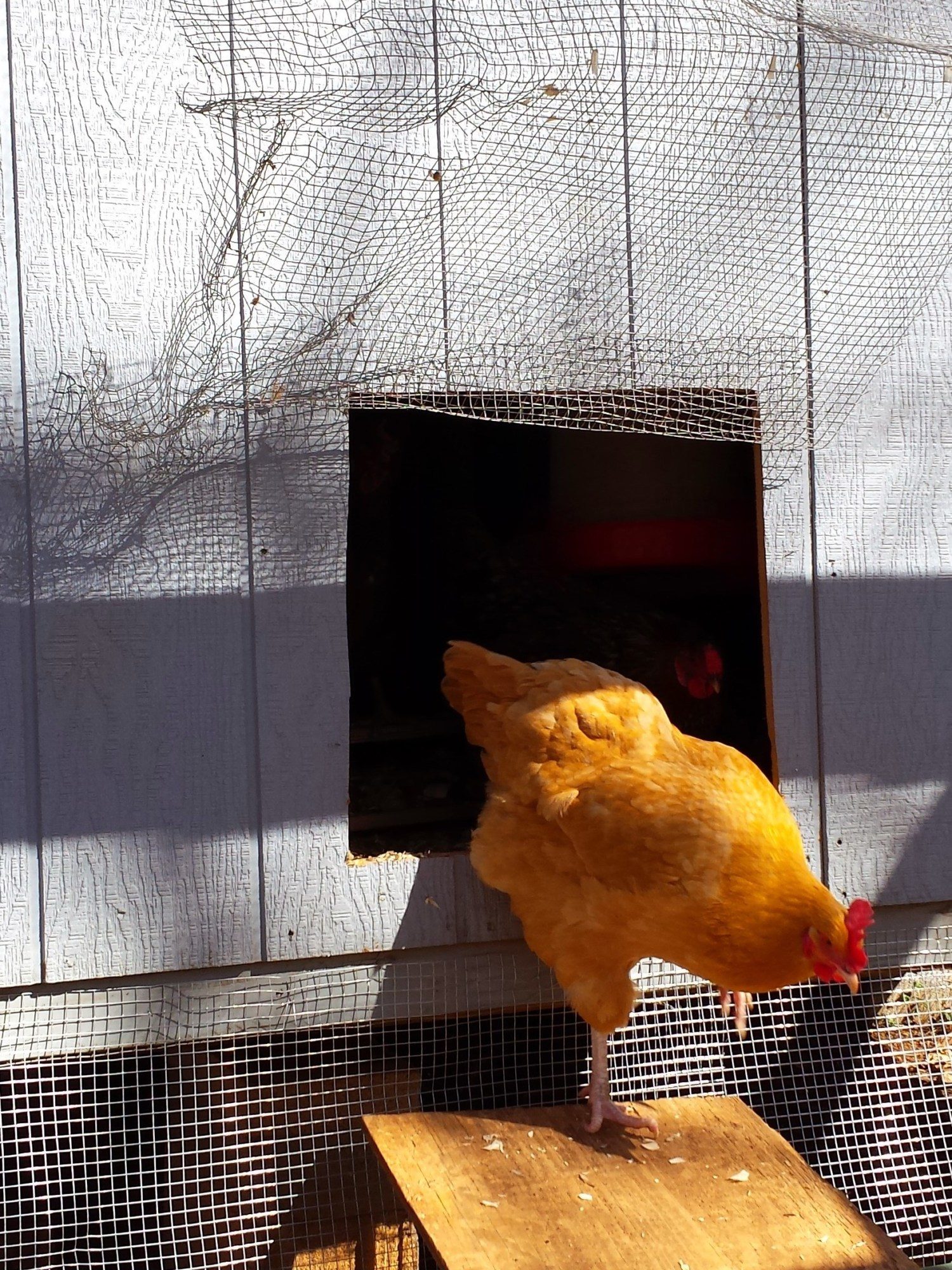 Here is Rocky, the once broody PR deciding how to get down. After two nights in a cage in the new coop, she finally stopped being broody.