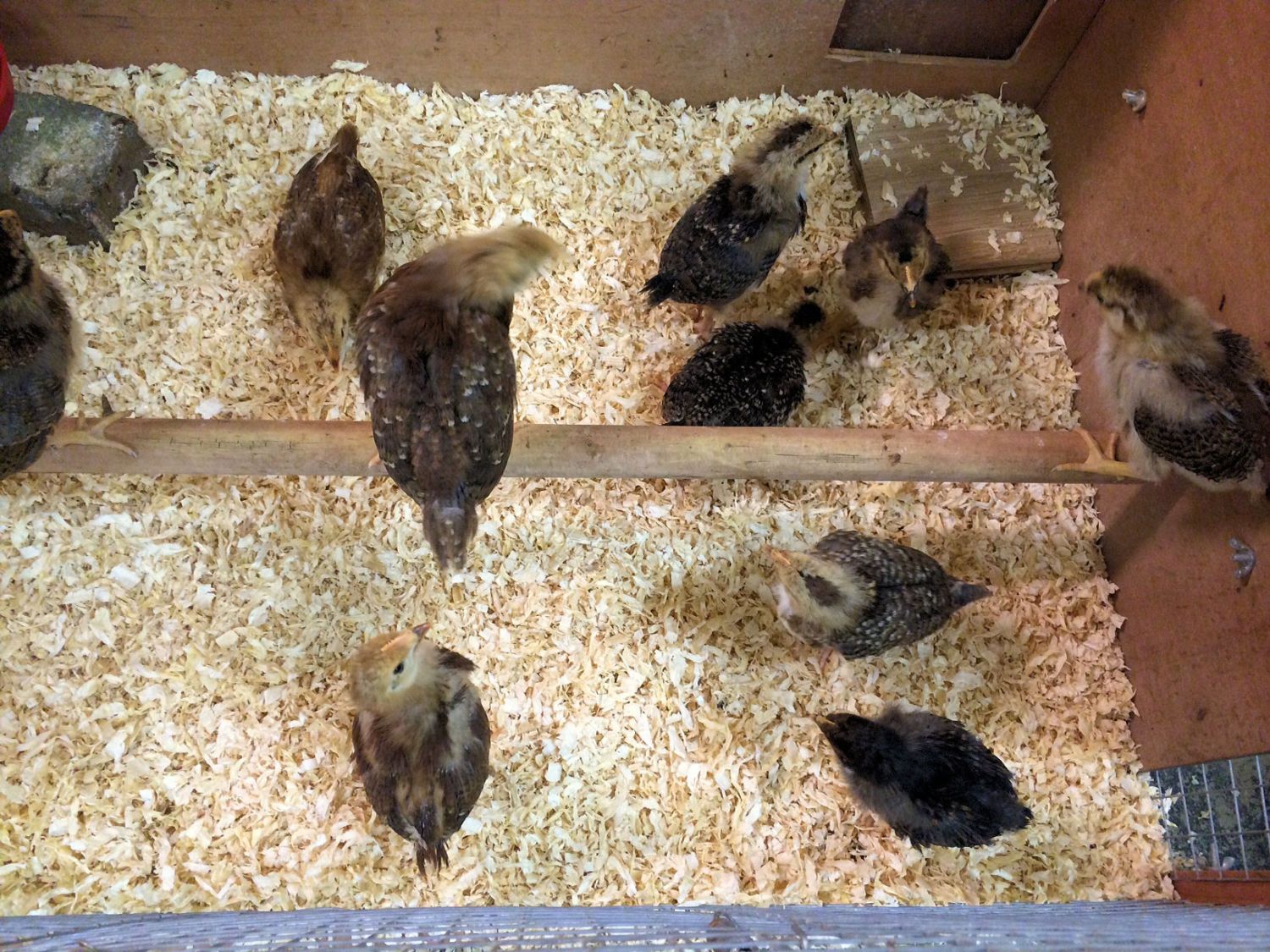 Here is the whole crew. I have two groups of three. I have a set of three, just like Primaknits, of the reddish chicks with white tips, and dark red feathers coming in (one of which is sitting on the roost in the pic). I only ordered two RIR's if that's what they are. I've never seen any quite like this.
