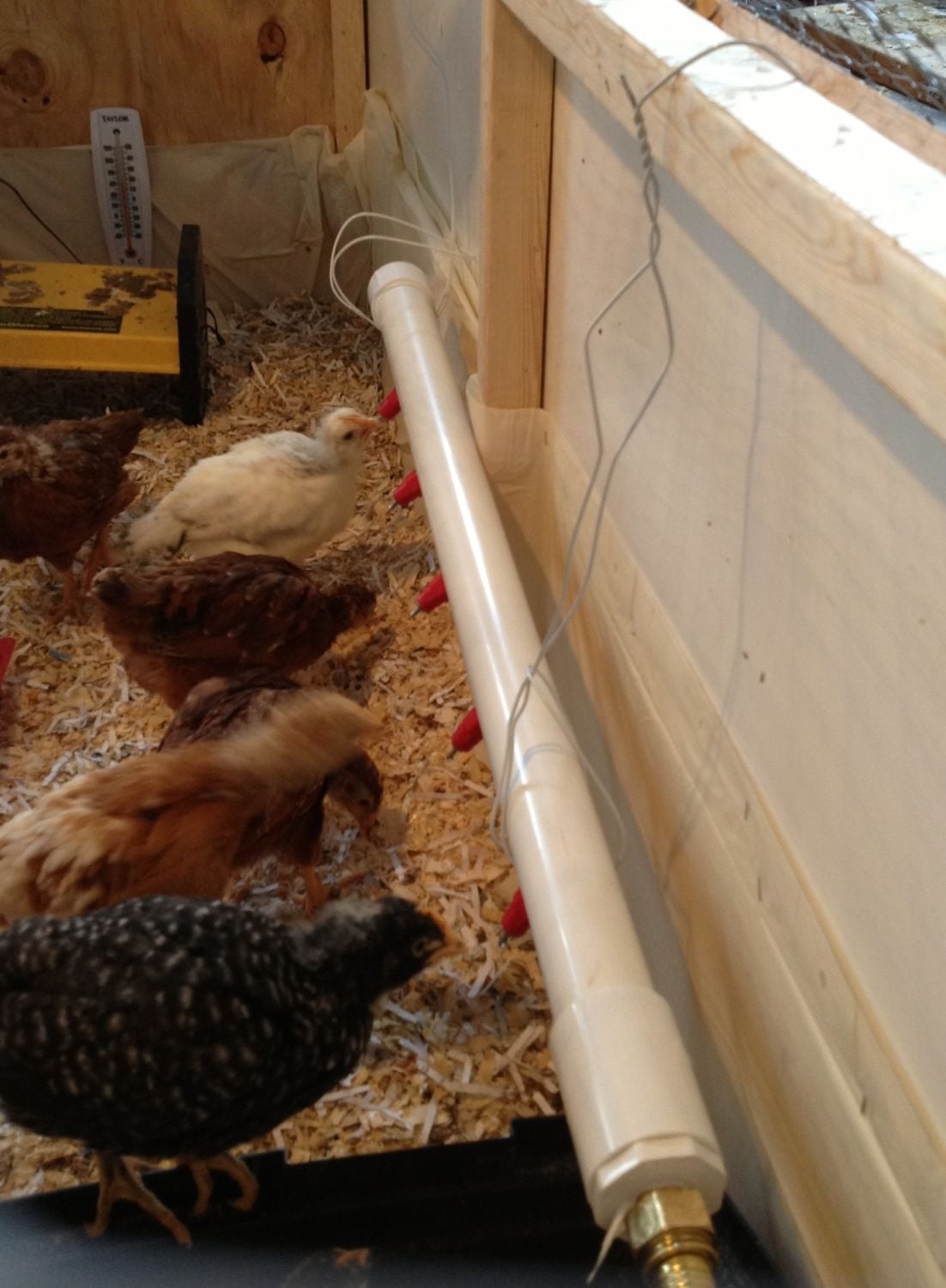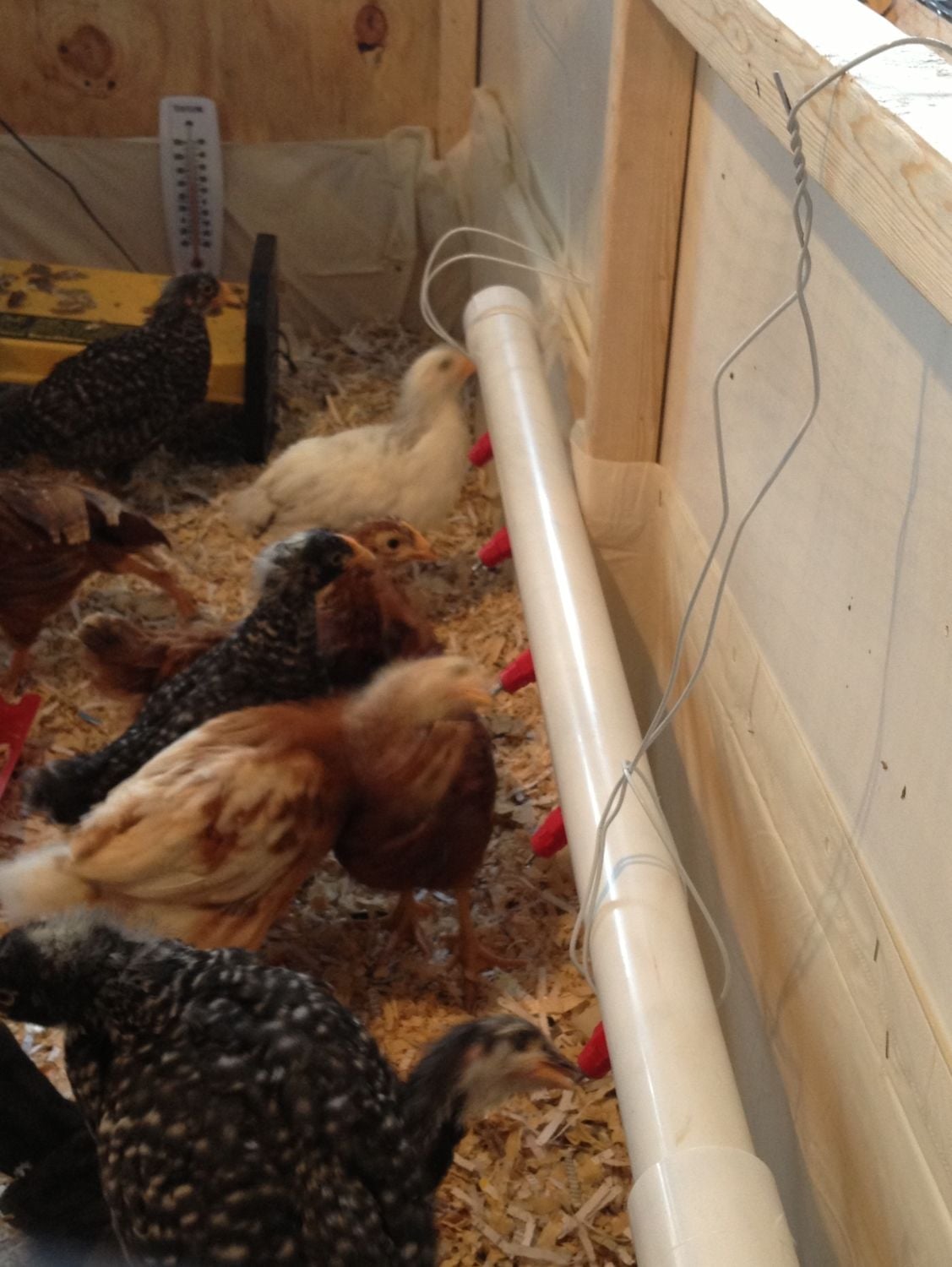 Our mystery chick from Meyer that turned out to be a welsummer, stretching her wing. She loves to sit on top of the waterer. She is the most docile bird and lets the younger ones push her around.
