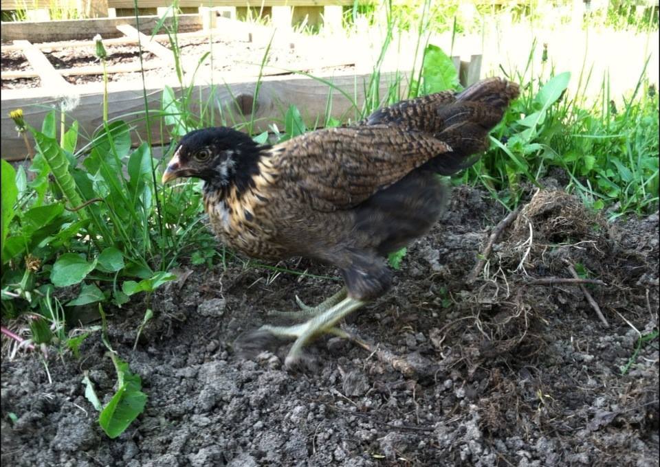 Clara our hawk... err Easter Egger at 6 weeks. She's so big and she may be at the top of the pecking order, she never challenges anyone and when anyone challenges her she simply flared her neck feathers, puffs up and/or raises her shoulders ever so slightly and the back down. No dancing, hopping or raising heads higher necessary.