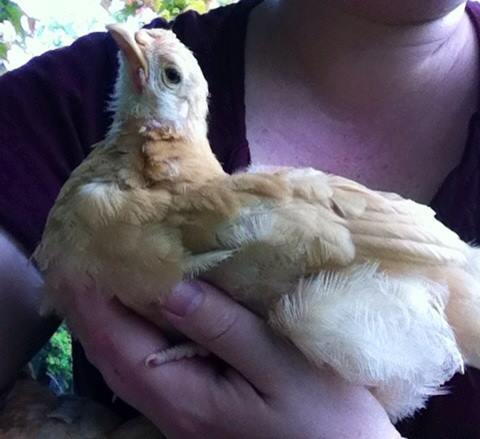Amelia our Golden Buff (sex-link) also six weeks. She may be the boldest but when it comes right down to it she's a big mama's girl. She and Clara don't like being picked up as much as the others, they prefer to fly to me, but once she's out of the brooder and has a bit of exploring she loves to cuddle. Those are Clara's bottom feathers next to her.