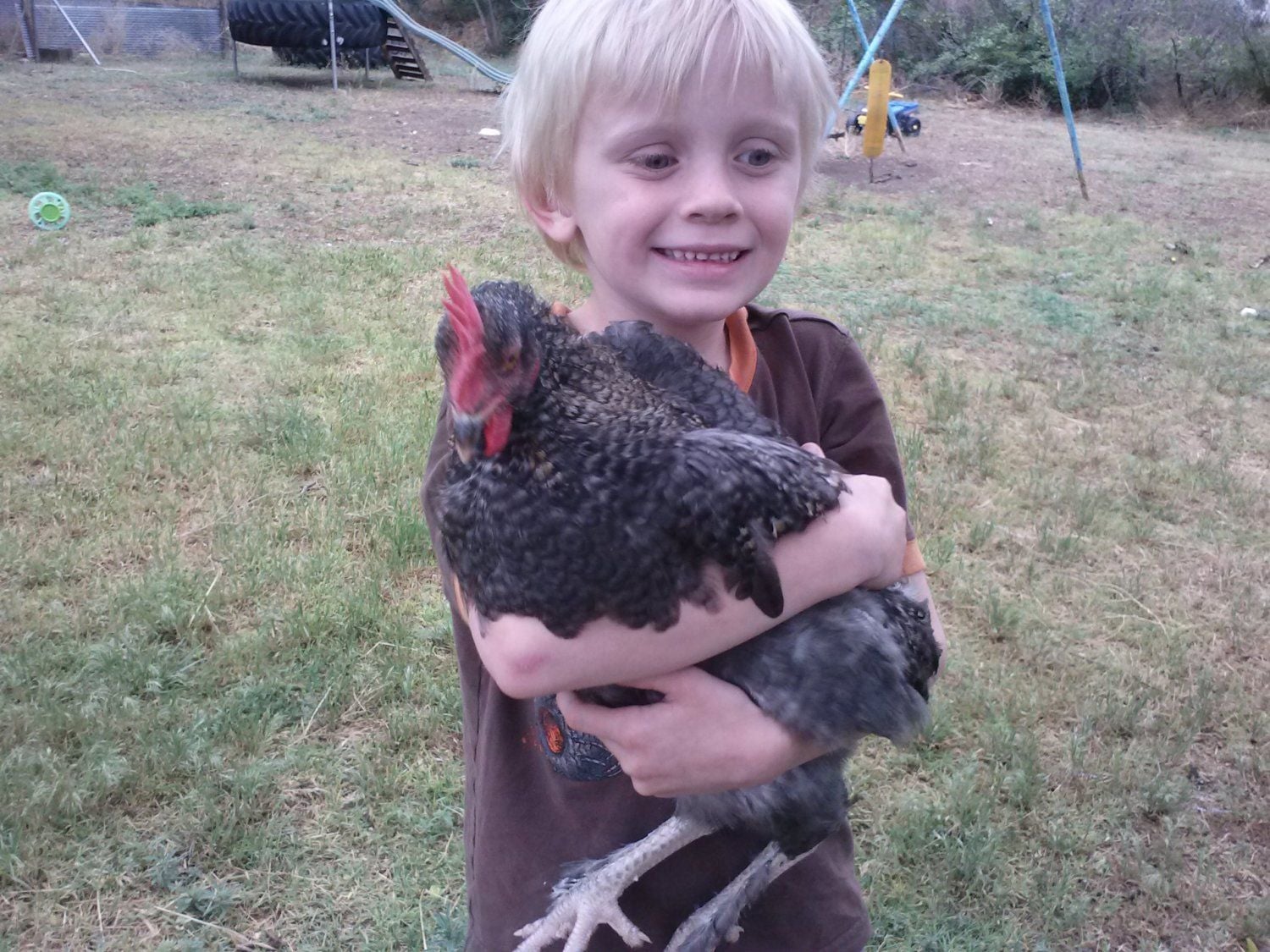 He almost looks like he has some Cream Legbar in him... the barring on the neck reminds me of my CCL's. I didn't even know there were buff Cochins! I'm not sure of a fence jumper... it looks like you got a completely wrong bird but that's kinda the fun of hatchery birds and I'm glad it worked out... your son looks absolutely adorable holding him!!