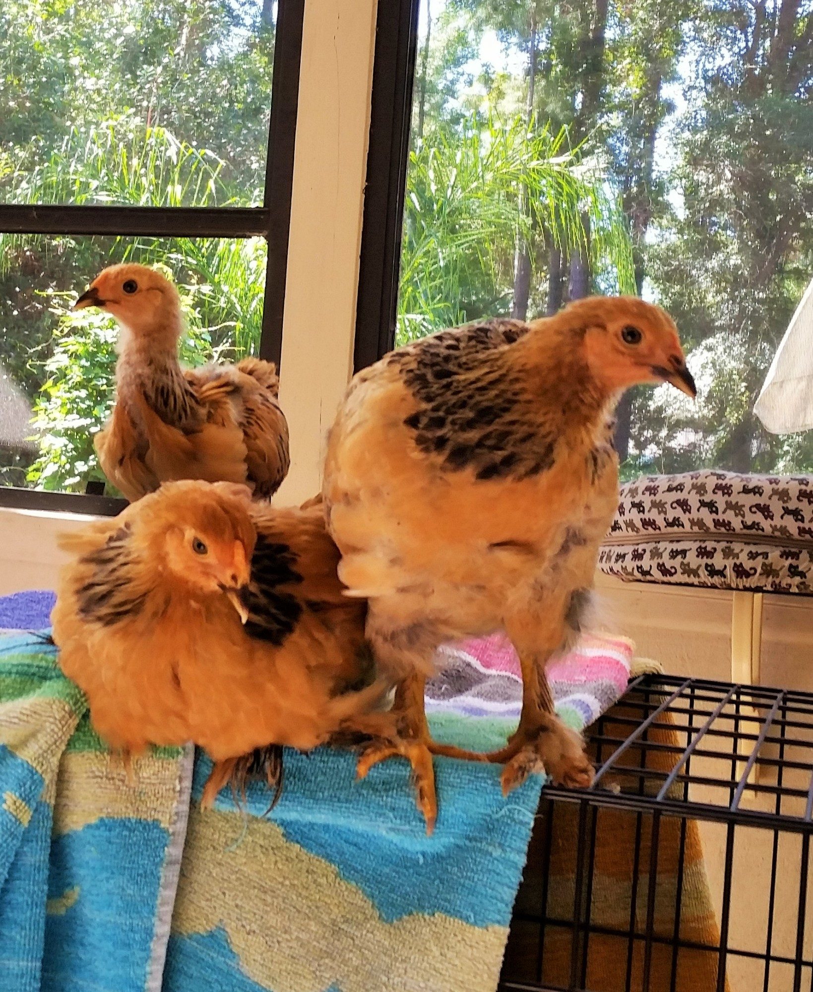 Our three are L'Juan, Yokey, and Peepsy.. Here they are a week ago (they currently reside in a very snazzy dog crate-turned pullet palace):