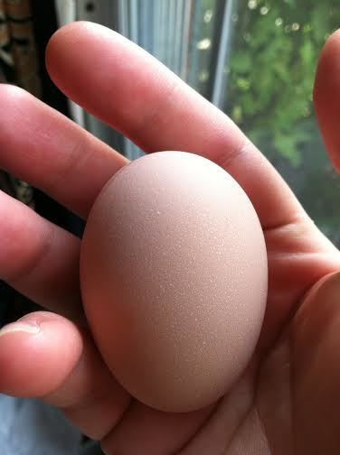 After lunch she is back in the nest box again squawking. We are getting ready to go grocery shopping at Earth Fare (where we spent way too much money on grass fed meat, organic snacks and other food, sigh). Before we left, my husband asked if I checked under Baby to see if she had laid. I hadn't thought she had, but checked anyway. Sure enough she was sitting on her first little pullet egg, singing the egg song, probably waiting for me to acknowledge that she had laid and tell her good job. Who knows at what point she had laid it, could have been minutes or hours, it was still warm but it was under her fluff. She could have laid it before Clara and I just didn't see it in the nest because its small and light. Once I scooped her and the egg up, told her she was a good girl and set her down in the run, she went to eat some shell, food and drink water and didn't return to the nest box for the rest of the day. So Baby beat Morgaine to laying, even though Morgaines comb and wattles are twice as large and red. I hope she doesn't carry on so long and loudly every time.