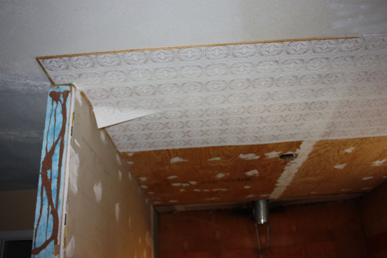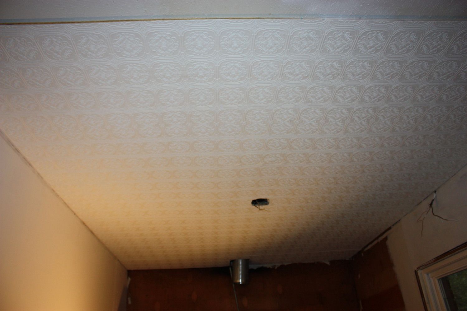 So with the ceiling prepped, I put up textured paintable wallpaper. It has the look of tiles.