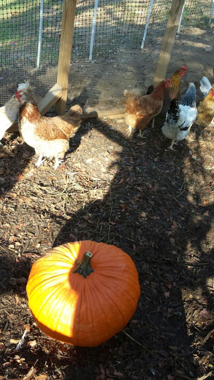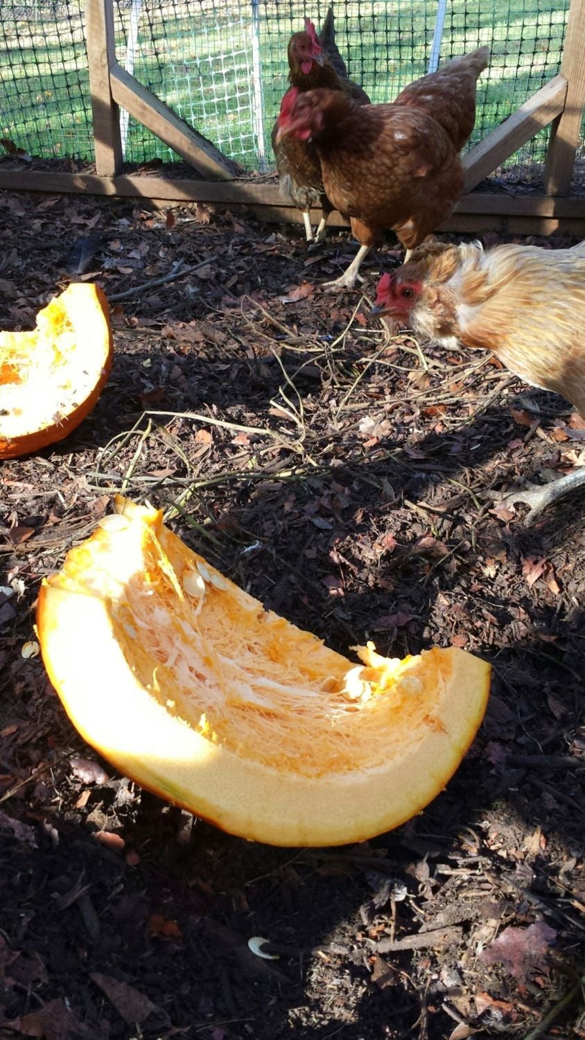 Lucky you with all those eggs! I gave mine their pumpkin a few days ago. They loved the seeds especially and are still working on the rest everyday. They were scared of it at first though.
