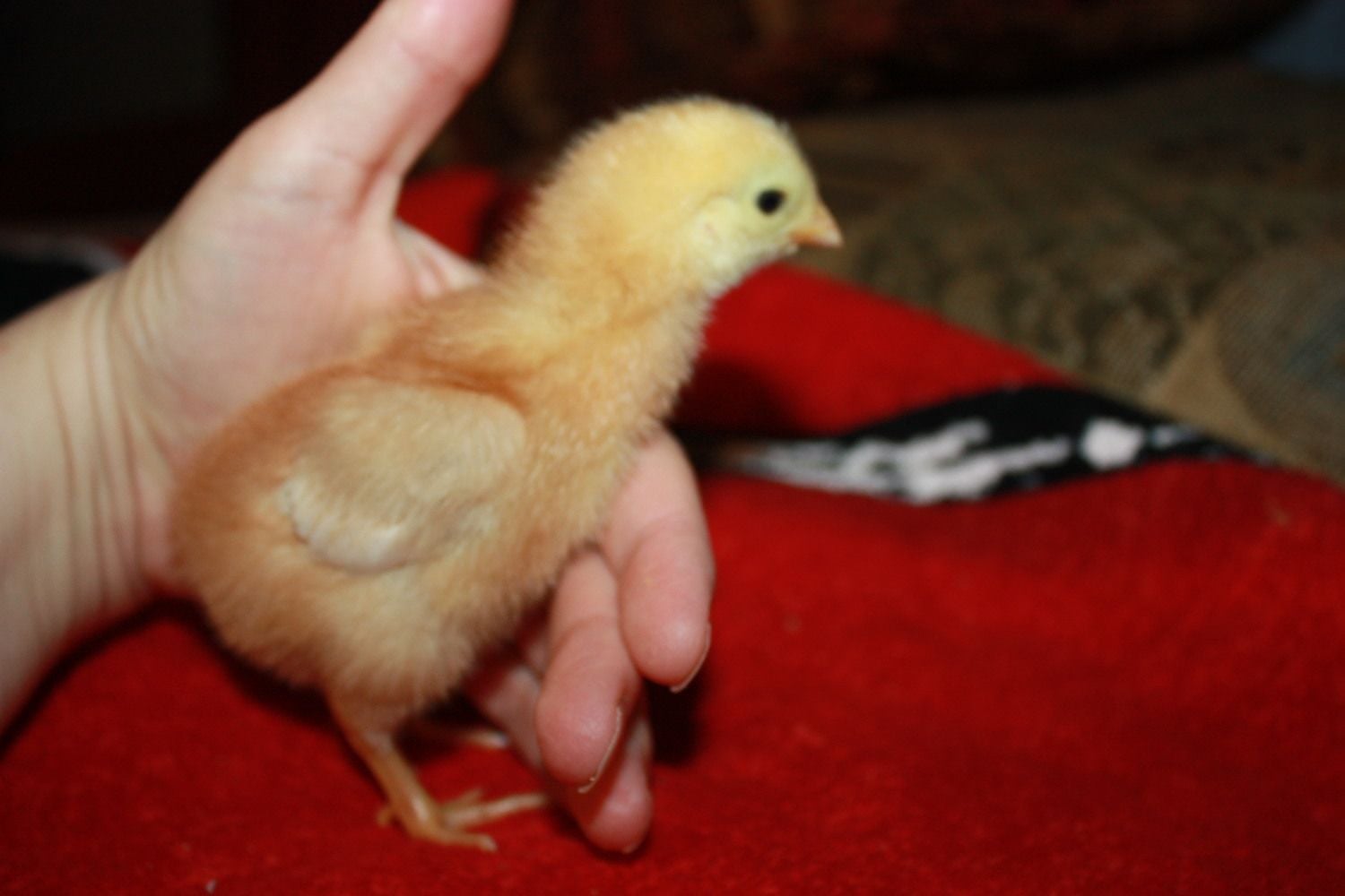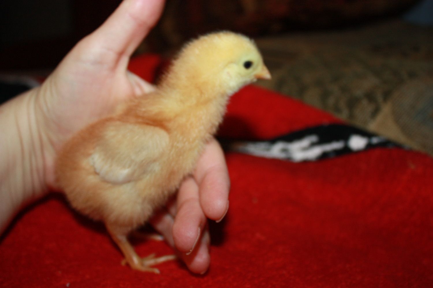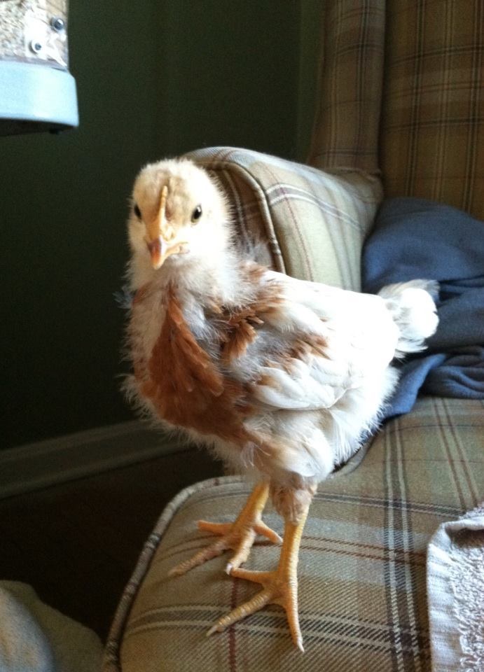 Oh goodness yes she's getting those red feathers! Here is my Amelia on day 25, a few days older than your girls. I love our Golden Buff, she is an everyday layer, of large caramel colored eggs, though her first few eggs were lavender colored. She has only skipped three days since she started 3 months ago (at 21 weeks) so about once a month. She is shy, sweet and quiet. She's at the bottom of the pecking order and while she doesn't love being held she will hop up onto my lap to beg for food. Here is what she looks like now: I just love the white on her neck and the lacing on her back. I think she's our prettiest girl.
