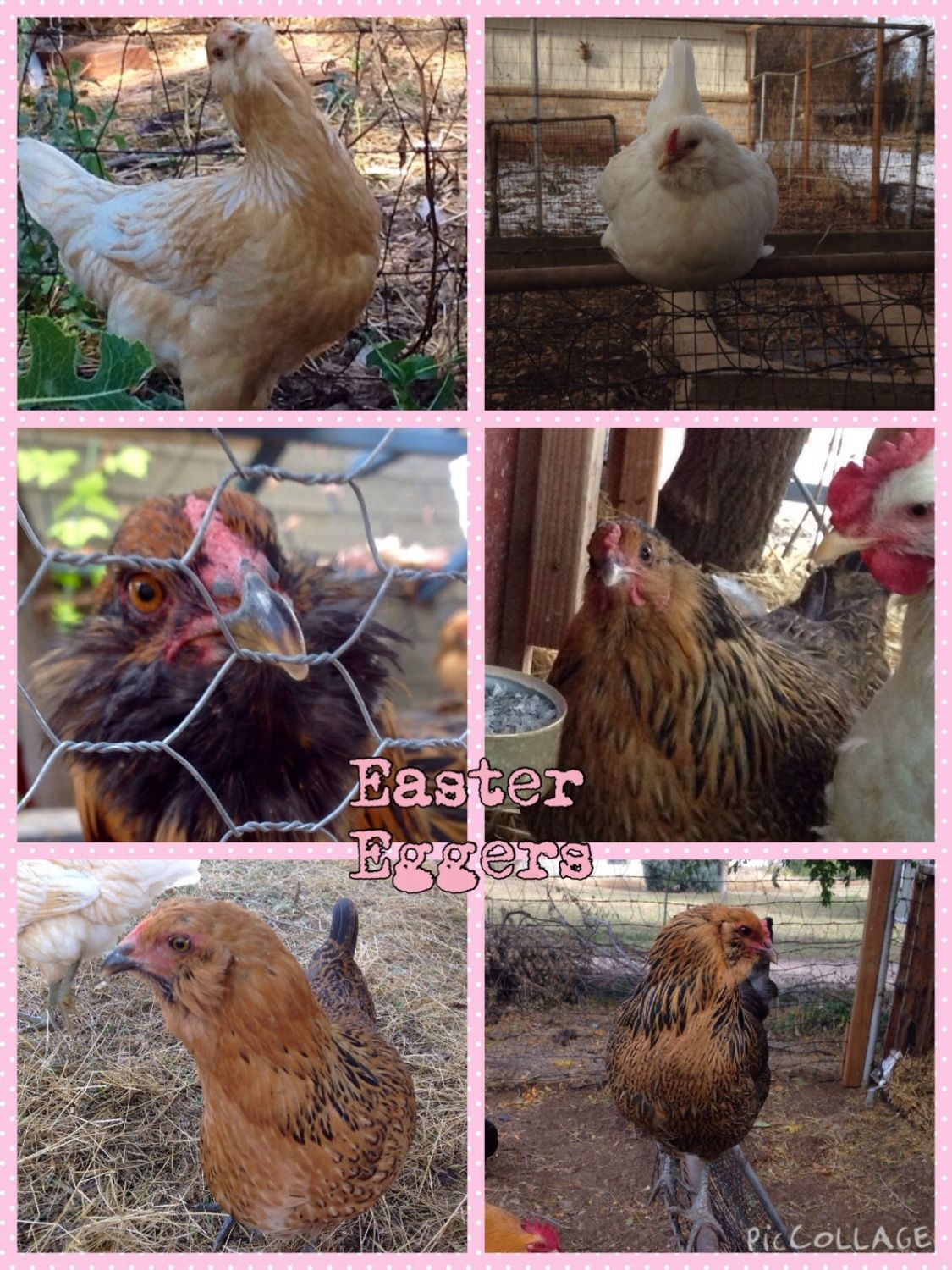 What a nice idea and what nice looking birds. I only have 22 but they are next to impossible to get individual pictures of...especially since I too have camera hogs and end up with pictures of chicken eye balls half the time.Here is a collage I did of our EE's, all of which are from Meyer.