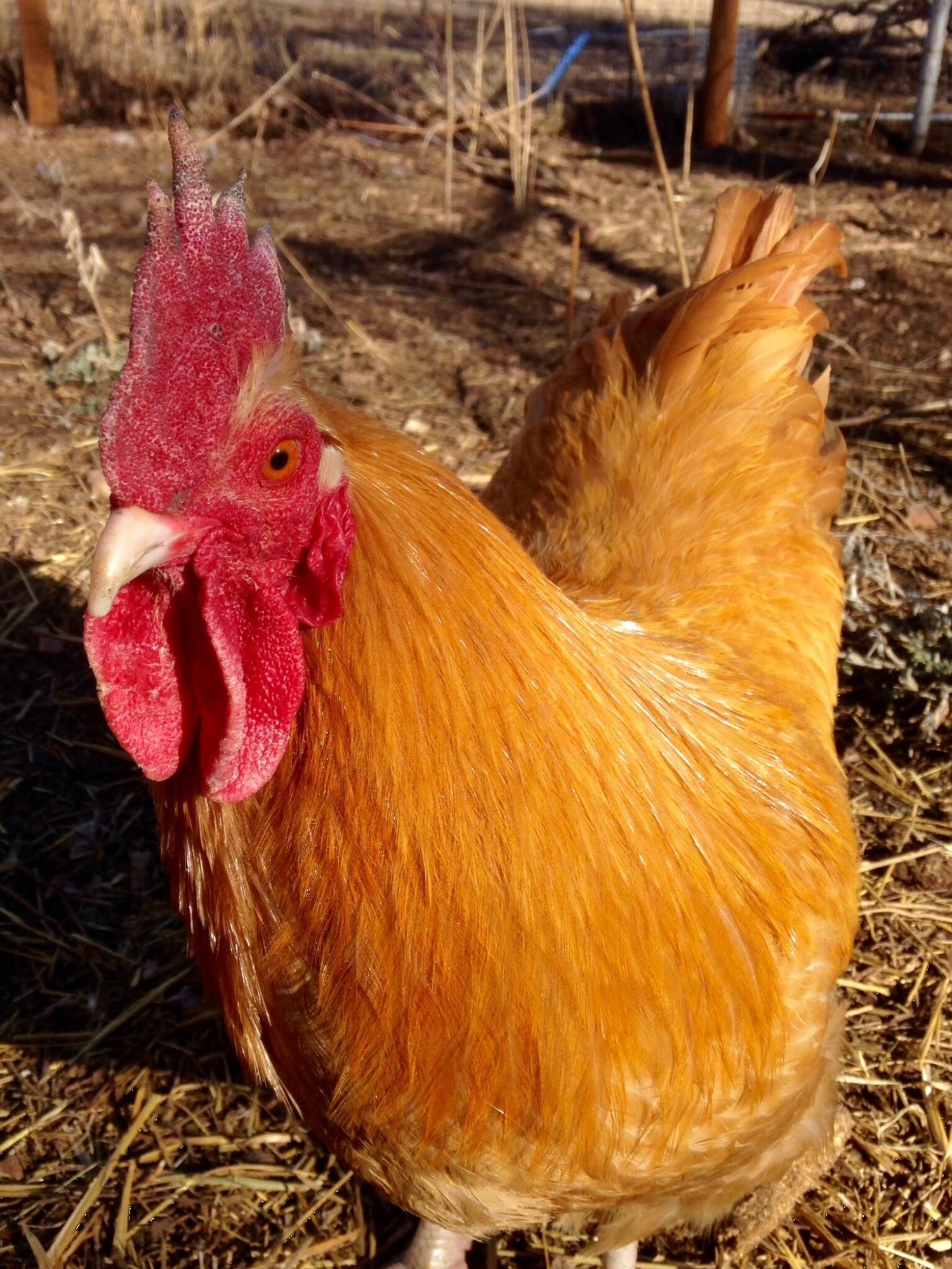 Shots of Rocco. I don't think I posted here but on Valentine's Day my BF and I culled and processed Bruno, our second in command BO roo. Probably four days after my wrist surgery, the gang was out free ranging and it was duskish so figured better go get everyone rounded up and into the run. When I got out there all the hens were in the run and the two roo's were still in free range area. At first glance I thought they had found something like a mouse and where standing over it, but when I rounded the corner, my heart sunk. They were both bloody and they were fighting, not just squabbling but fighting. They were exhausted and I was able to grab Bruno with my good arm and yelled at my dear BF to come help. He grabbed Rocco, both were very bloody and it was dark, I have a bad arm and my BF couldn't deal with them atm due to work. So we put Bruno in the small coop and let Rocco be with the flock. I was so sad, why....I know chickens do this, but still, they had never fought. Anyway, the next day, I reviewed the video tapes from the chicken areas and found that they had been fighting for forty minutes, maybe longer as the beginning of the fight seemed to happen somewhere off camera view. The next day, I was able to look at them both and Bruno took the brunt of it of the top of his head and comb as evidenced by the missing feathers and blood. Rocco seemed to have healed from frostbite just fine, only to have some of his wattles ripped off during the fight. The flock is adjusting, Rocco is very Leary of me and looks a bit smaller than he used too, I think due to the frostbite on his wattles and now the stress & recovery from the fight. I am trying to win his heart by hand feeding him his fav snacks, grapes, BOSS and kale. A lot of the girls have bald backs from the boys obviously competing for dominance, so that helped seal the deal for Bruno. I have already seen some of the girls starting to get pin feather again.
