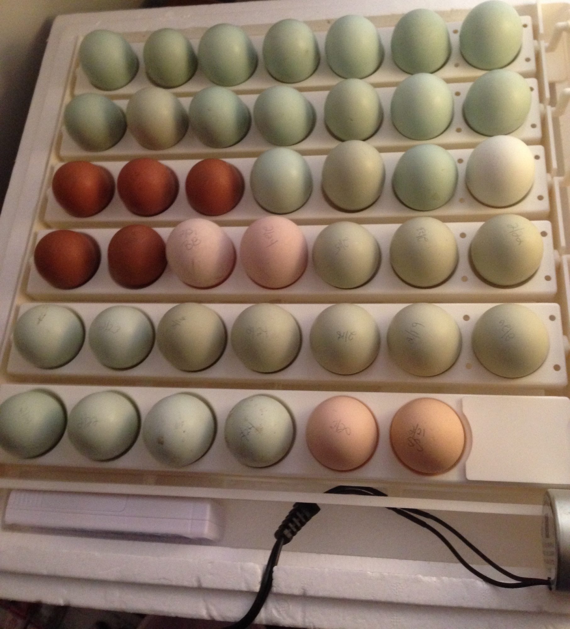 These are the eggs I'm setting today. Oh my nerves! My splash ameraucana is laying some of those pretty blue eggs stacked on top. My black ameraucana is laying the slightly greener ones. The bottom ones are those wheatens I ordered. And I threw some wellie and buff brahma eggs in for good measure. They should make some cute EEs and OEs.