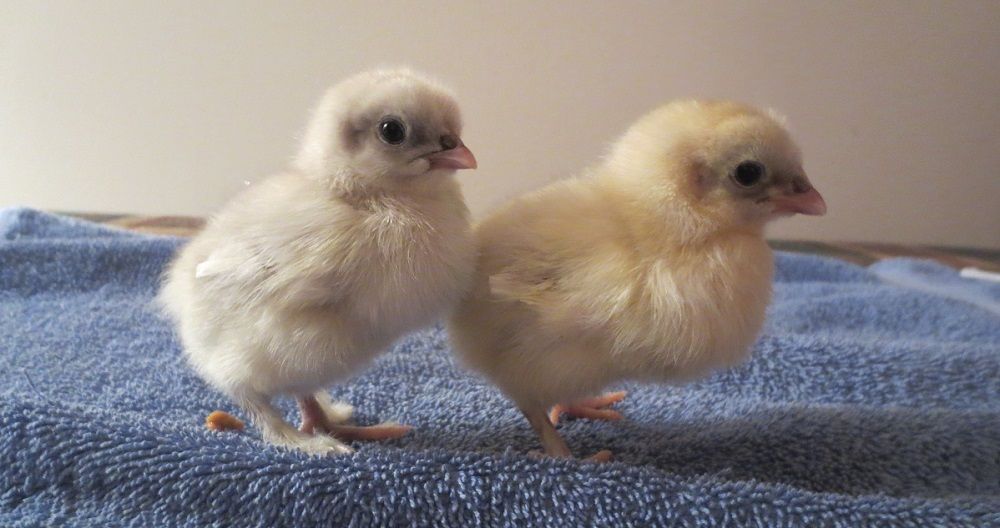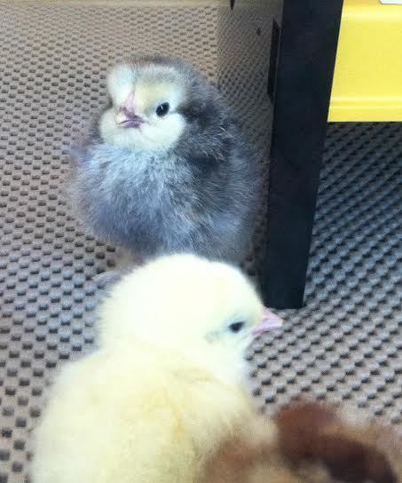 Here are my two Blue Splash Marans chicks I picked up from there last week: