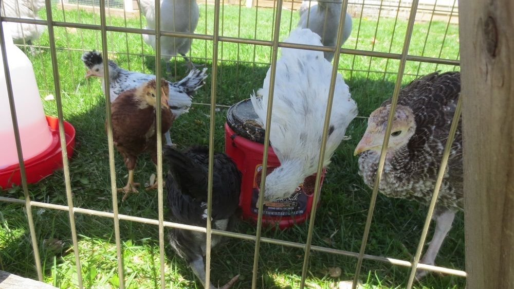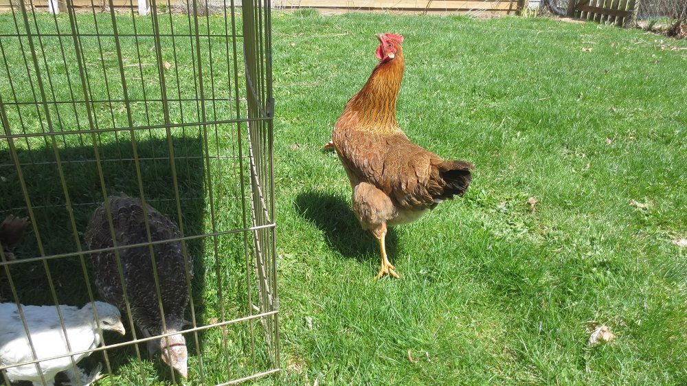 We had really warm sunny weather this weekend, so I dragged my old puppy ex-pen out of my attic and made a little makeshift play pen for my chicks to spend the afternoon outside. Some of my older hens came around and looked at them through the wire. But only while I was there, and when I went in the house, they all drifted off to their regular foraging activities. I think they were more interested in the structure anyway, than in the chicks.