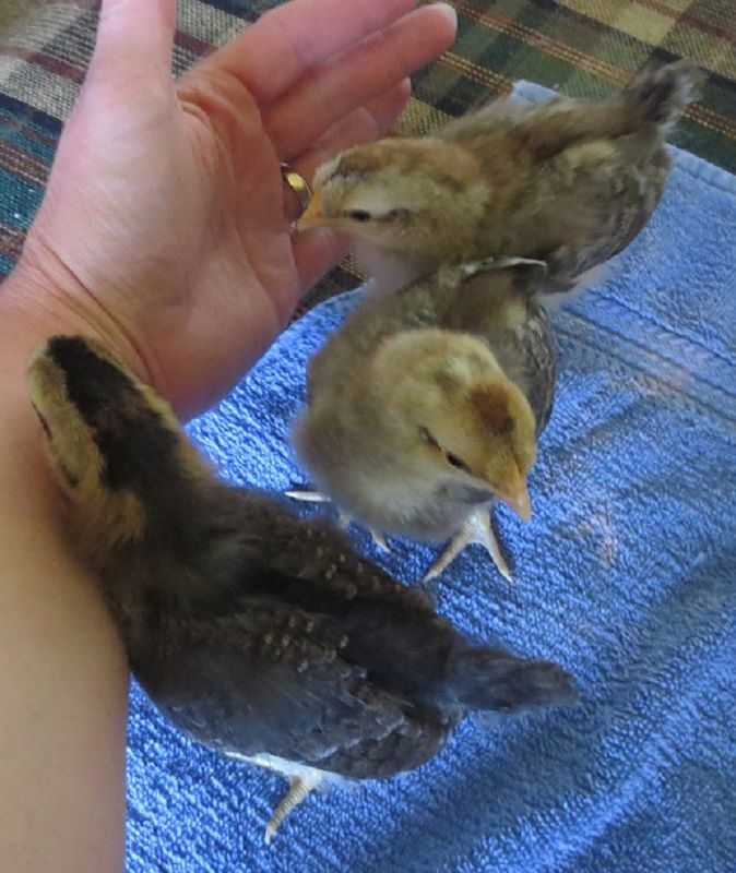 Yes, male and two females. That is the yellow head spot you see in the middle one. The darker one in front of him is his sister. The one in the back I got from a different breeder. She throws me off because she is as pale as the male. But she has all the proper chick marks that she is supposed to have to tell the females, just in a paler version than the front chick. And, I can't wait, because a third breeder whose list I have been on for a long time contacted me, and I am going probably this weekend, to get a third female legbar from her! She has lighter and darker as well, and she said I can pick which ever one I want. So I said I would try to find one that looks different to the ones I already have. She has chicks from her own eggs, and she also hatched some from eggs she got from the same breeder as my brother and sister pair. It's possible I may come home with another sister.
