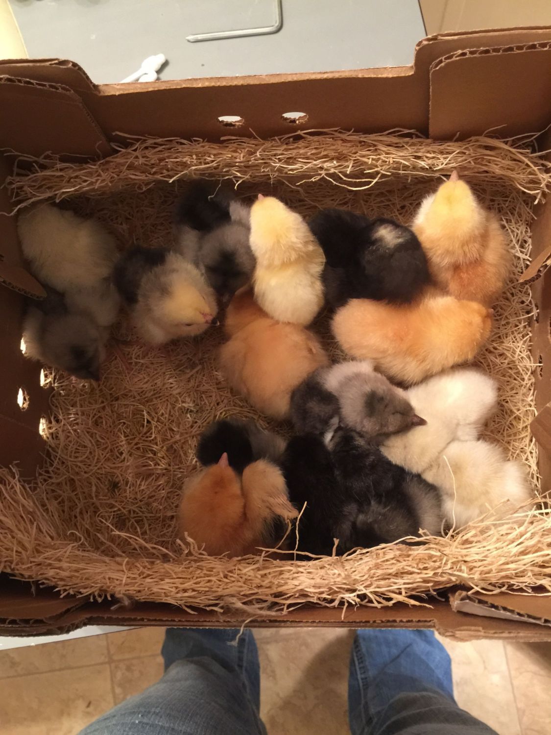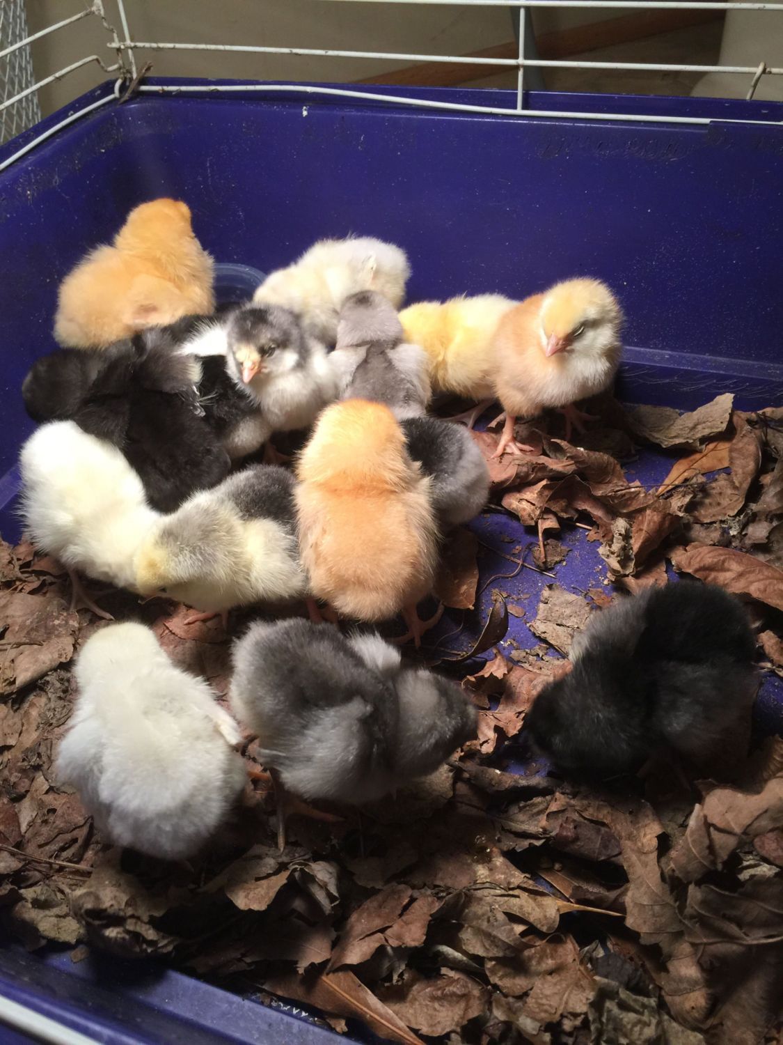 !!!!! Looks like an awesome assortment, how exciting! You have at least three blues, maybe four, a couple could be splash, can't tell what breed without leg or side pics. A few reds, I would guess New Hampshire but could be Rhode Island or Buckeye. And those two in the bottom right corner have the silver gene, I don't know all the breeds that have that White Marans do (not White Rocks or Delawares but your light yellow ones could be those) or they could be splash. Get them settled then more pics today or tomorrow will be helpful. Congrats!!!