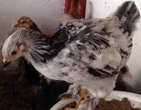 Cute! Love Buff Orps! Congrats! Our girls are 7 weeks/50 days old and have gotten so big and have stopped going under their warmer. Looking back at our chick pics from last year, at that age they were big too. Of course there is some variation: Please excuse the fuzzy image but this illustrates the size difference between our Brahma and Welsummer. A little concerned the Brahma looks like a cockerel in this pic, really hoping that's not the case. Christine do you have pics of your Brahma's at this age? Snow was very concerned about a sound from downstairs, she stood frozen like that for over a minute.
