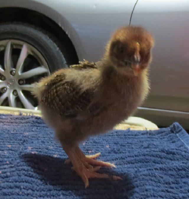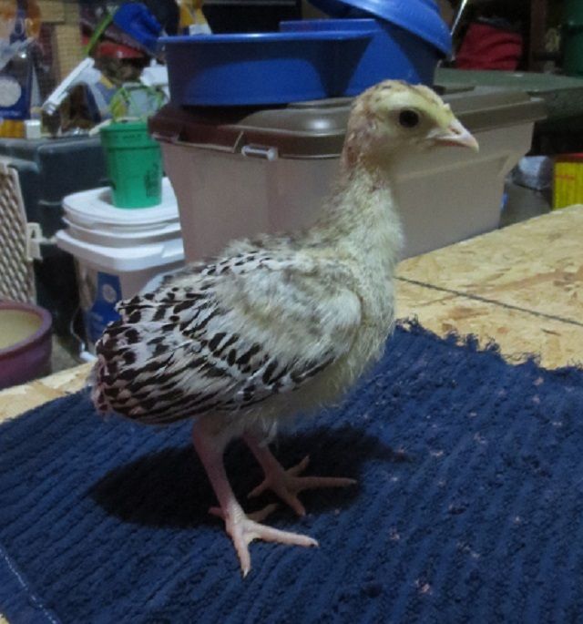 And Poppyseed the turkey is in there, too. Ella (Partridge Plymouth Rock) at two weeks old:
