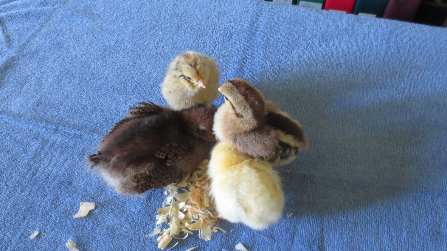 Anyway, the girls are 8 days old in these pics, and doing great. They are all growing like weeds--it seems like they are twice as big and strong as they were last week when we got them--and getting along fine, eating well, etc. The marans chick looked like she was getting pasty butt a couple times, but I got her cleaned up and I think she should be ok. We are trying to keep them socialized, and they are all still a little flighty, but they calm down quickly when we hold them, fall asleep on our arms, etc., so I think it's going fine.