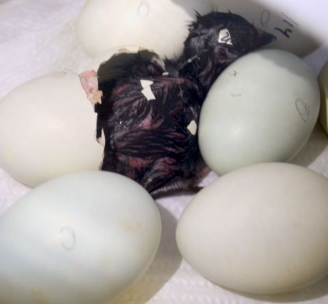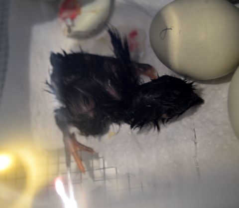 2 in bator, 1 hatched late yesterday looking good so will leave it there until this afternoon. 1 has a funky leg, looks like a hip problem and will examine and maybe have to cull later today.