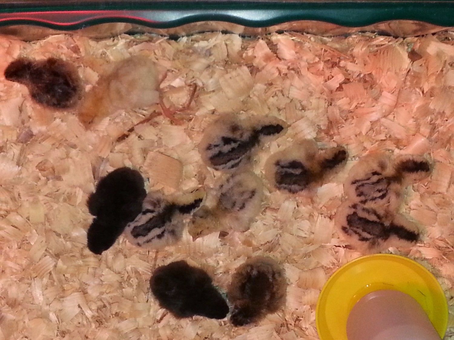 I took this pic just a second ago. These are the 11 in the brooder. I have two newest hatches in the bator with the 2 unpipped eggs. The top two on the left, first EE, then RSL cross. The two striped in the middle group with the gray on their backs opposed to the dark color on the back are the DellaBlues (two of them, the rest are Iowa Blue chicks).