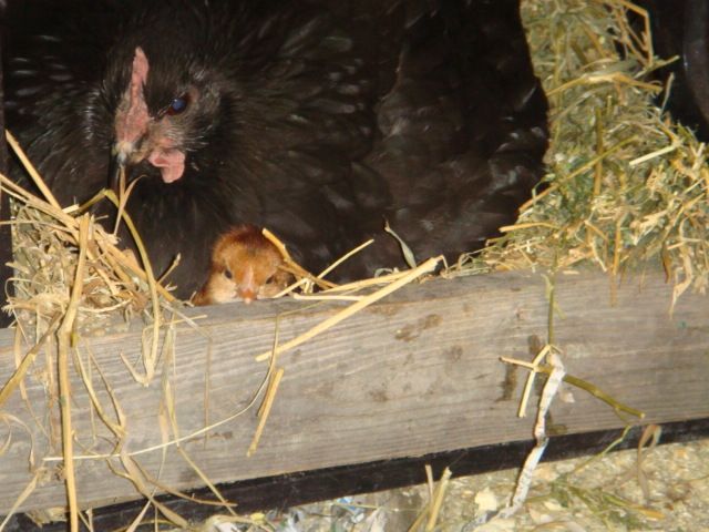 I was shocked this evening when looking in on Millie, the hen we thought had not been successful in hatching the eggs given to her. I'm standing there speaking to the chicken, offering sympathy because her efforts,erratic though they were, would be to no avail. So, when my eyes adjust to the dim light.... A chick is peering at me from under Millies breast. With a feather i could have beeen knocked over, but Hooray, anyway..There are more but I didn't count them. Maybe I can add a pict of her & one.